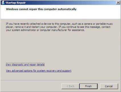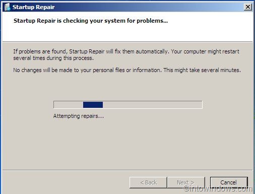 When startup repair launches, it will automatically attempt repairs. It won’t work, but this initial stage can’t be bypassed: