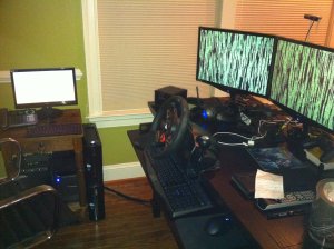 The second shot shows the completed room. Not bad really considering how much computing power is piled into that corner. The Gateways stack pretty well and the network is all nestled under the end table. The little monitor proves how great it is once again by slotting in pretty much anywhere. The IO Gear KVM is of the fixed cable variety, and these are usually very messy, but I am able to tuck it away behind the table and it has a neat remote, so nothing is showing. The mini keyboard (decent for $10!) rounds out the setup.