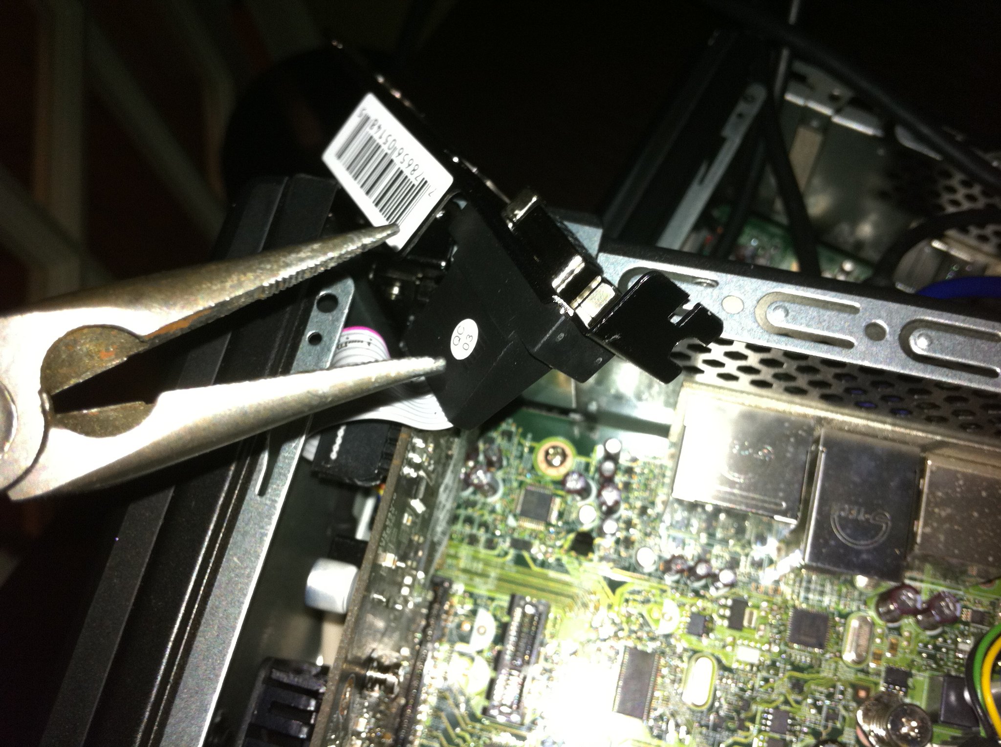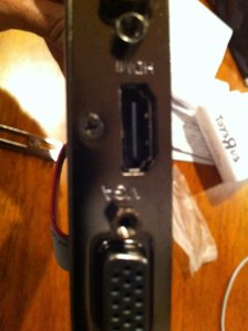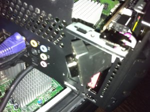 The bracket removes easily enough, but the LP bracket being DP and DVI only is a bit of a stumper. One option is to use a DVI to VGA adapter, but I prefer not to do that. The other option is to do some quick and dirty moding “import tuner” style. I decide to thread the VGA ribbon cable through the PCI slot and then rely on the usual PCI bracket play to hold the connector in place externally with the card seated. The Gateway has a really odd slot cover arrangement, by the way. Instead of the usual blank plate screwed in place (or, gasp, a blank plate clipped in place), it actually has a blank plate machined onto the slot. You actually need to break the slot cover off like a metal tab. It’s easy, but its strange and, of course, leaves you with no mounting screw. No screw? No problem! We have the Mystery Screw that we discovered rattling around the case yesterday!