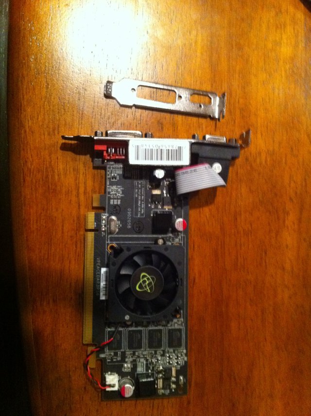 Mission “return the giant ATI cards” was a success! A quick swap for a Sapphire 5570 1GB Low Profile and an XFX 5450 1GB Low Profile (these cards are very similar, but differ in some interesting ways) and we are back in business. The new cards ran $65 each, so a slight savings, but the main thing is they are low profile.