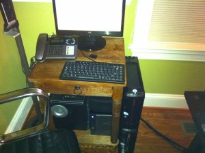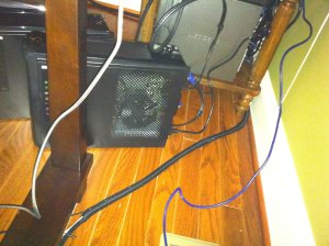 The final result is much cleaner with the Sapphire. Time to close up the second system and move both of them to their final resting place. I have decided to push the thermal profile of my home office to the limits and locate these two hosts side by side with my monster gaming rig. I figure if the central heat ever goes, the family can huddle in the office and enjoy some incredibly energy inefficient, but super effective heating! Originally I had located the test server at the structured wiring closet in the basement, but I plan to do a lot more tinkering with this build so a console nearby is handy. First step is to plug these bad boys into the UPS because, hey, its there so why not use it! In all seriousness, having the ESX servers, the core infrastructure switches, and the NAS all on UPS might actually come in handy at some point (beyond just for the happiness of seeing the “UPS” light lit in the NAS management console). The UPS is an APC Smart UPS 750, so it should be fine for the NAS, 2 SFF machines, the tiny monitor and the two switches.