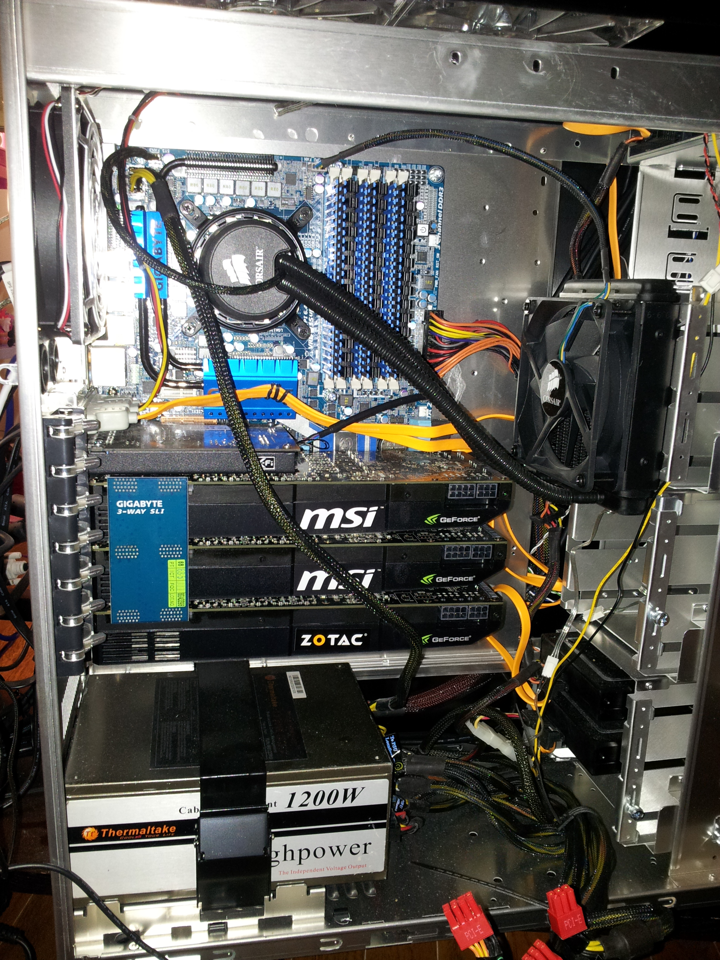 Ah… GTX580s… It seems like just yesterday when you were newly arrived! You gave me heat. You gave me noise. You gave me power bills. And you gave me insufficient framerates in Metro 2033 5040×1050 3D surround! You will be missed my friends! This is also a good time to just show some Lian-Li PC-A77F love; a case that is such a joy to work in it almost makes upgrades worth it just for the opportunity to open it up… Almost. So anyhow, now you see them!