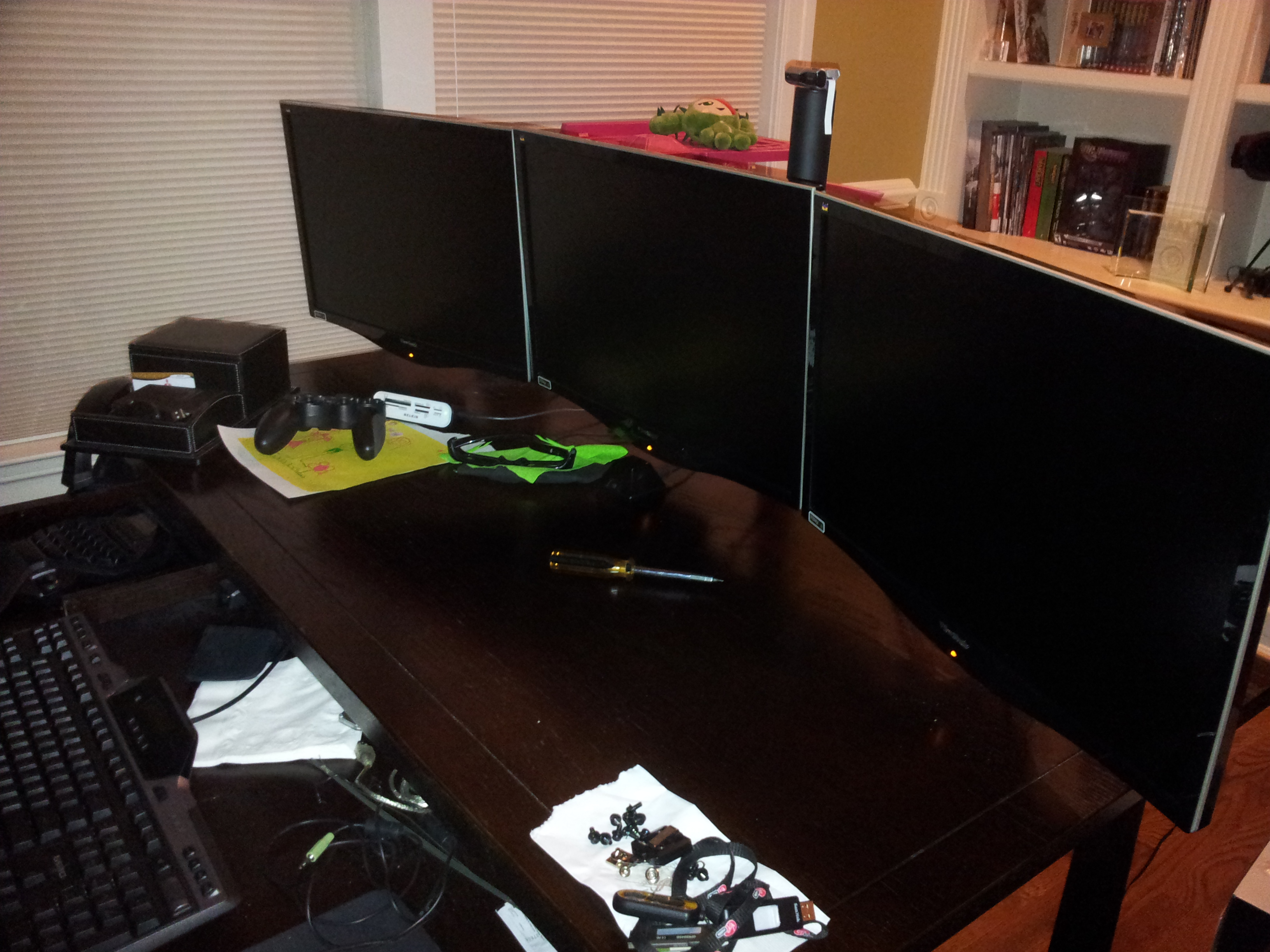 I know that this Siig triple monitor mount isn’t the best. I also know that better rigs can be found online. I am ashamed, but not too proud, to admit that three overriding urges guide most of my purchases; impulsiveness, laziness and impatience. It’s an odd cocktail of dysfunction that ultimately manifests itself in me buying lots of stuff from Micro Center. Basically, if its in stock at Micro Center in PA, thats probably the part I’m buying (occasional flirtations with Newegg and Amazon notwithstanding). I pretend that I’m helping the local economy in a meaningful way to assuage my guilty conscience over not being purely “over” brick and mortar.