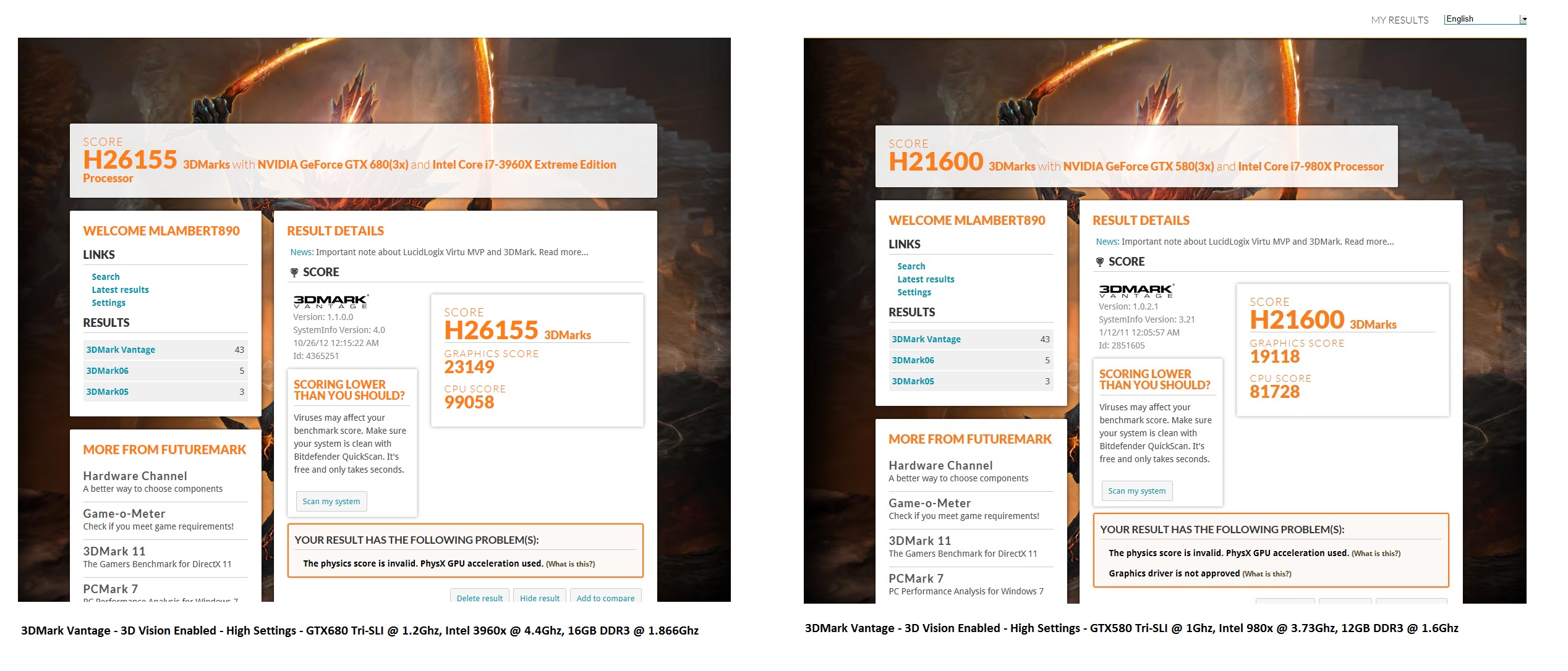 Wanted to take a moment and share some results that you don’t see all that often on the blogosphere. Now that the new build is done and stable, I ran through the worst case scenario – 3D Mark Vantage with 3D enabled at High Settings (I can’t run Extreme because my 3 panels are 1680×1050 and Extreme requires 1080P). The data I had for the old system was with PPU enabled (which takes a huge burden off of the CPU), so I ran the new system that way also. It is interesting to note that the new system actually still beat the old one even with PPU disabled (and increased load on the CPU). Results with PPU disabled for the new system were 24000. Here is how the two systems stack up: