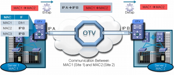 First up is Cisco OTV or Open Transport Virtualization (incidentally HP has a similar technology known as EVI or Ethernet Virtual Interconnect. The problem these technologies attempt to solve is the need to move IP addresses around over a large geographic area. By design, IP is all about segmenting a network into subnets. The idea was that datalink protocols like Ethernet were limited in their ability to scale, and that building big networks based on them required tying them together using bridges which allowed expansion but carried lots of complexity at scale. Datalink protocols basically see the world as flat. IP, and other network layer protocols, allow an administrator to segment a network into digestible chunks by applying logical address schemes. Considering this background, its rather ironic that virtual datalink topologies like OTV and EVI seek to improve the agility of IP networks by collapsing the bite sized chunks back into big flat spaces. What they actually do at a technical level is create a virtualized overlay network. What this means is that all of the Ethernet traffic originating from servers and clients, is encapsulated into GRE (a container protocol used for creating a tunnel through which network traffic can be sent) and then re-transmitted over IP. Consider this model (courtesy of Cisco):