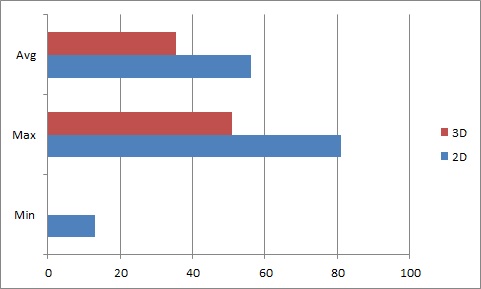 Looks like the FarCry engine isn’t quite up to Crysis levels, or perhaps the jungle setting is more intense than the Cell Factory level. Both games look fantastic. Subjectively, the performance is excellent in 2D, but feels a bit choppy in 3D. NVidia reports that the 3D Vision support is “fair” and there are some noticeably anomalies with depth and object rendering in the 3D plane. Unlike the flawless Crysis 3 experience, the Far Cry 3 3D experience needs some refinement. Mins are rough in both cases, but there is a likely misconfiguration snafu that caused this which I will discuss below. In any event, they aren’t really felt in 2D whereas in 3D they seem to have more impact. The time to render analysis should tell the tale there. First 2D: