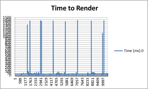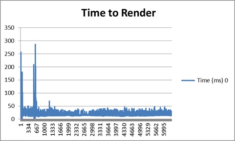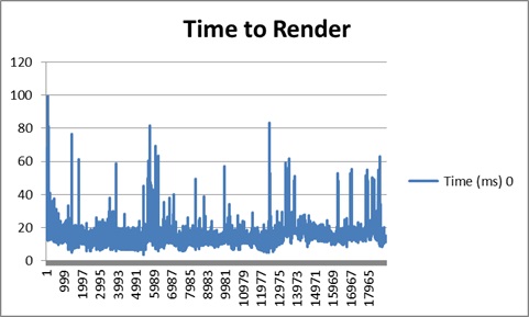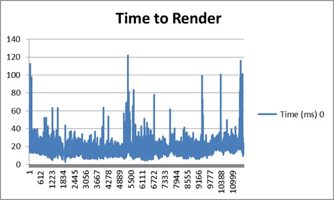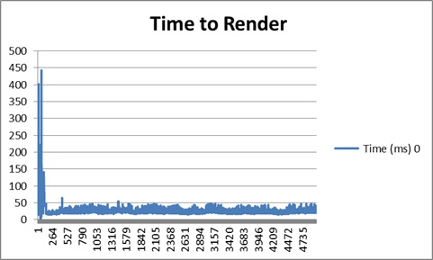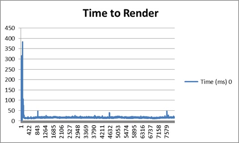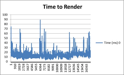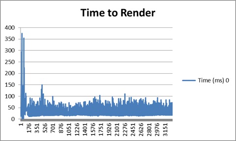 Interesting results from the render time analysis for 2D. Looking at the graph the bulk of the frame rendering is occurring in less than 25ms (about 40fps). There are some huge spikes early on, but I believe these are likely the result of how FarCry reacts to starting the FRAPs benchmark. Turns out F11 is mapped to quick load, which is also the default setting to start benchmark testing in FRAPs. As a result, FRAPs starts benching as the game starts loading. After 10 seconds or so it does settle in however. In any event, the frame rate delivery isn’t very spikey overall which does explain the subjectively smooth experience. Now lets see how 3D held up: