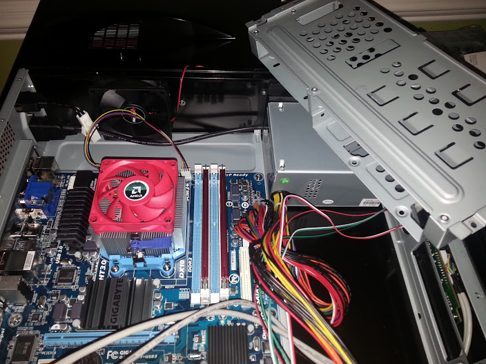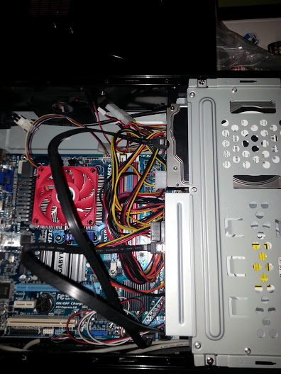 mATX is a big tight to work in, so the first order of business was pulling the drive cage. I braced for the worst, but was pleasantly surprised! Just like that this little budget case was winning me over. The drive cage was well designed and removed smoothly with just two screws. The LG DVD and the (yikes!) old Maxtor PATA 3.5″ drives fit snugly into their respective compartments :