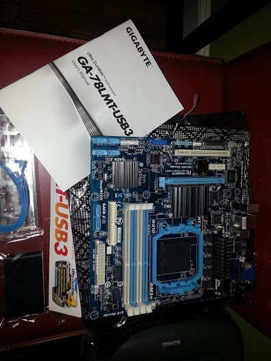 So with the cage removed, populated, and set aside, it was time to have a look at the motherboard. I chose the Gigabyte because it was one of the only 760G, AM3+, mATX boards that had the confirmed ability to go north of 8GB RAM. I had a good experience with Gigabyte on my X58 build, and tend to bounce between them, EVGA and ASUS, so it seemed like a solid choice: