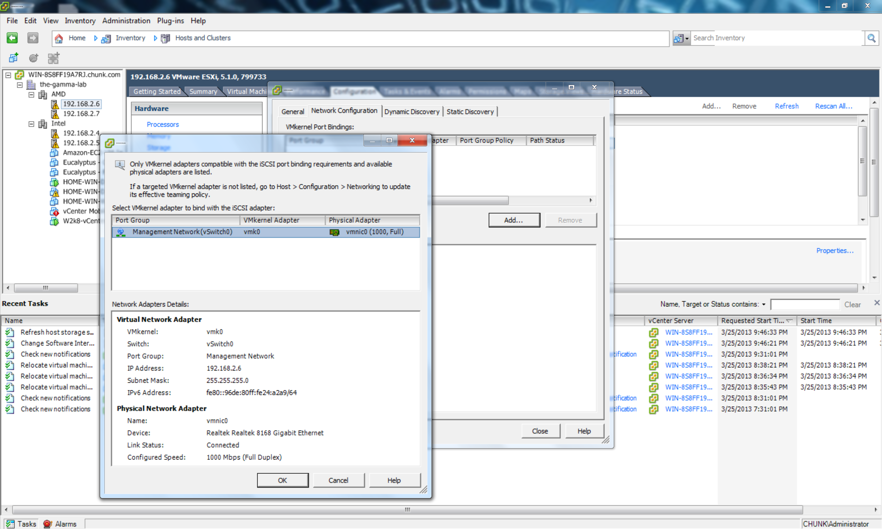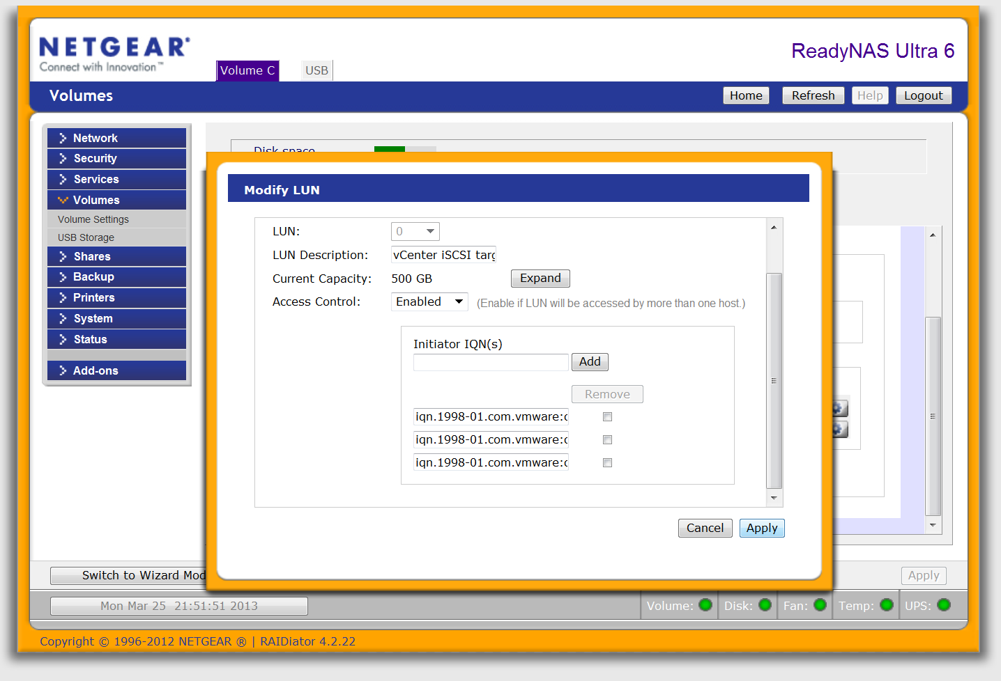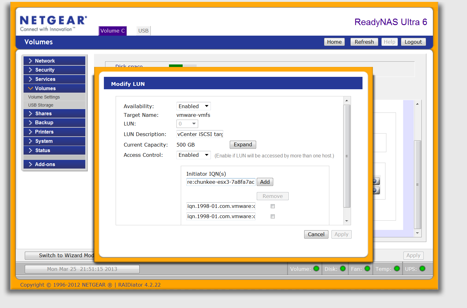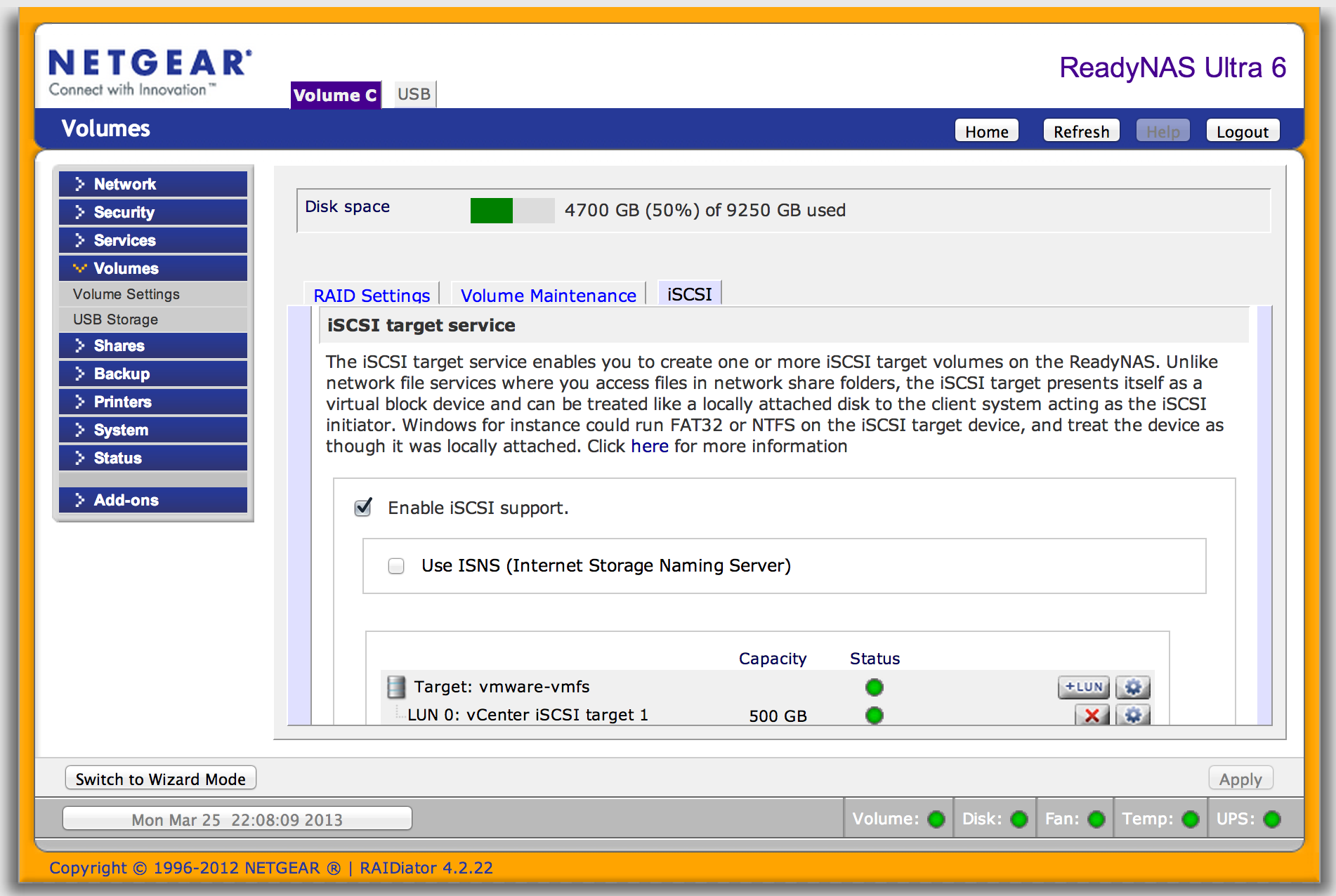 I’ve gone through a few iterations of vSphere storage configuration over the years. Initially, for simplicity, I had independent ESX servers up with DAS being used for local instance storage and no shared media (and no vCenter or clustering obviously). When I upgraded my NAS to the NetGear ReadyNAS Ultra 6 I decided to migrate the virtual machines to an NFS datastore hosted on the NAS (1Gb/s, managed Cisco switch). That worked well, and was effortless to setup and configure, but at heart I’m a block storage guy and I continually felt the call of iSCSI (especially since NetGear supports it on the RNU). iSCSI can be somewhat intimidating at first to those not familiar with configuring remote block storage, but if you take it one step at a time it is quite straightforward and, in my opinion, definitely easier than typical fiber channel attached SAN configuration. Here is a view of the three main configuration screens for iSCSI on the ReadyNAS along with explanations of what is being presented and how to configure it: