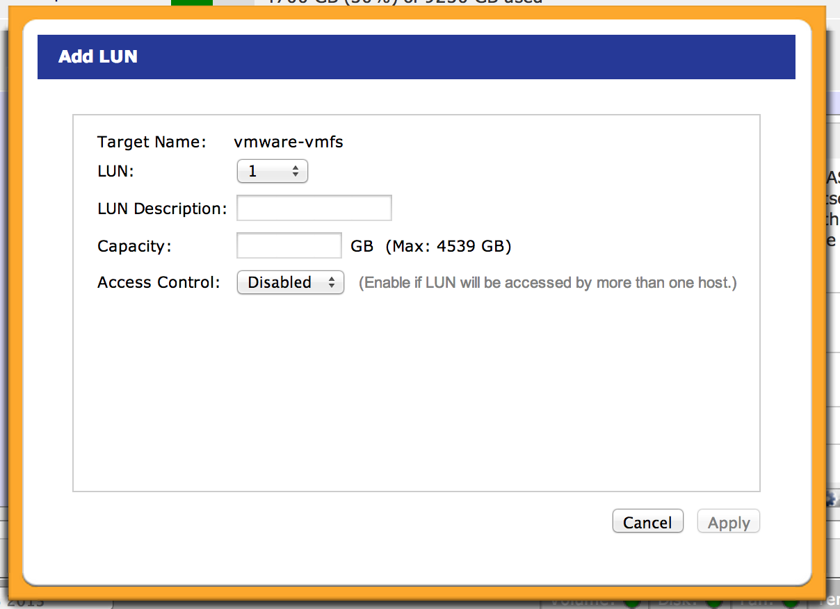 Back in the NAS config UI, the new initiator can be granted permission to the target by pasting in the iSCSI name from vCenter into the access control section of the LUN configuration under Initiator IQN (iSCSI qualified name):