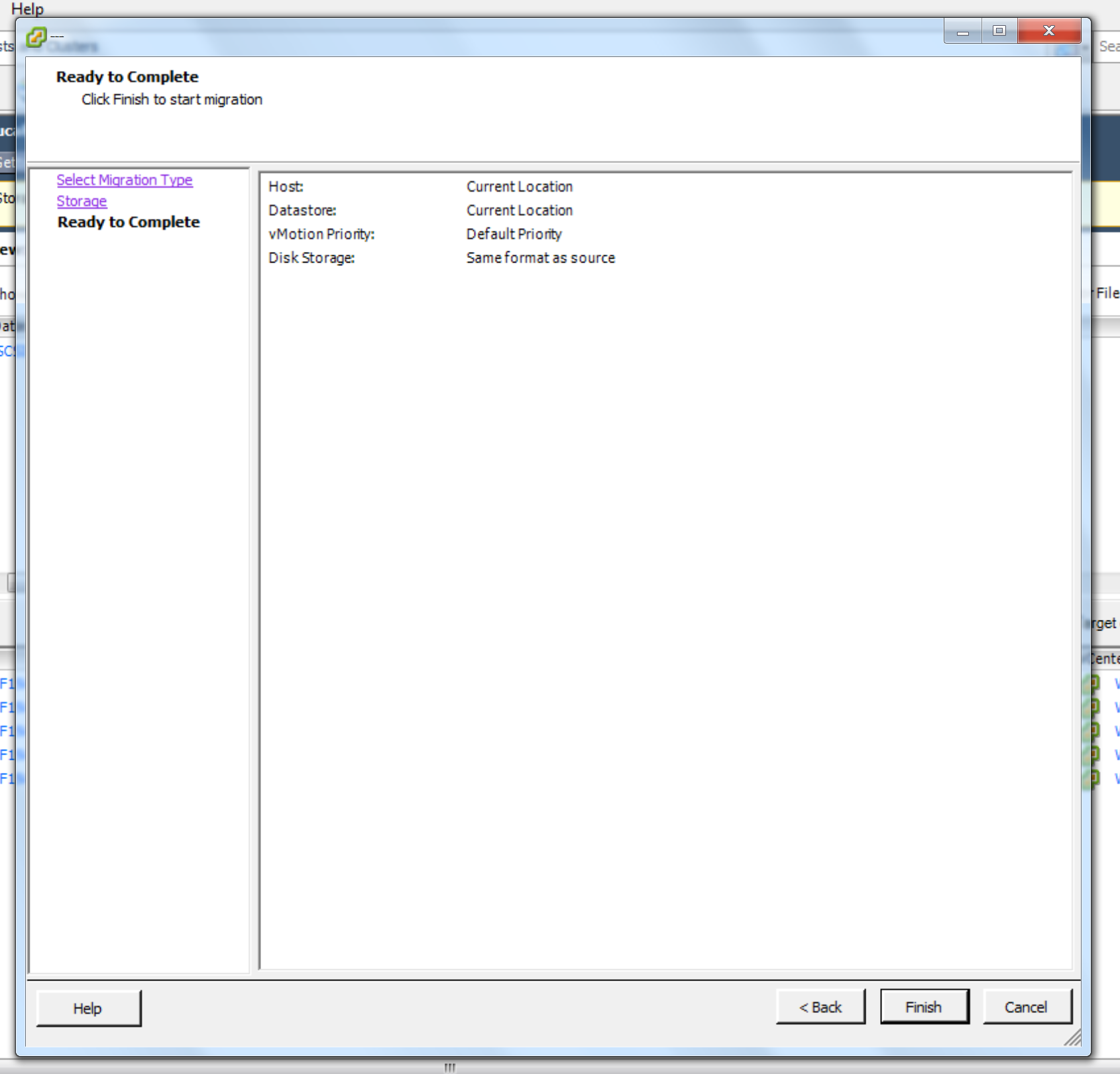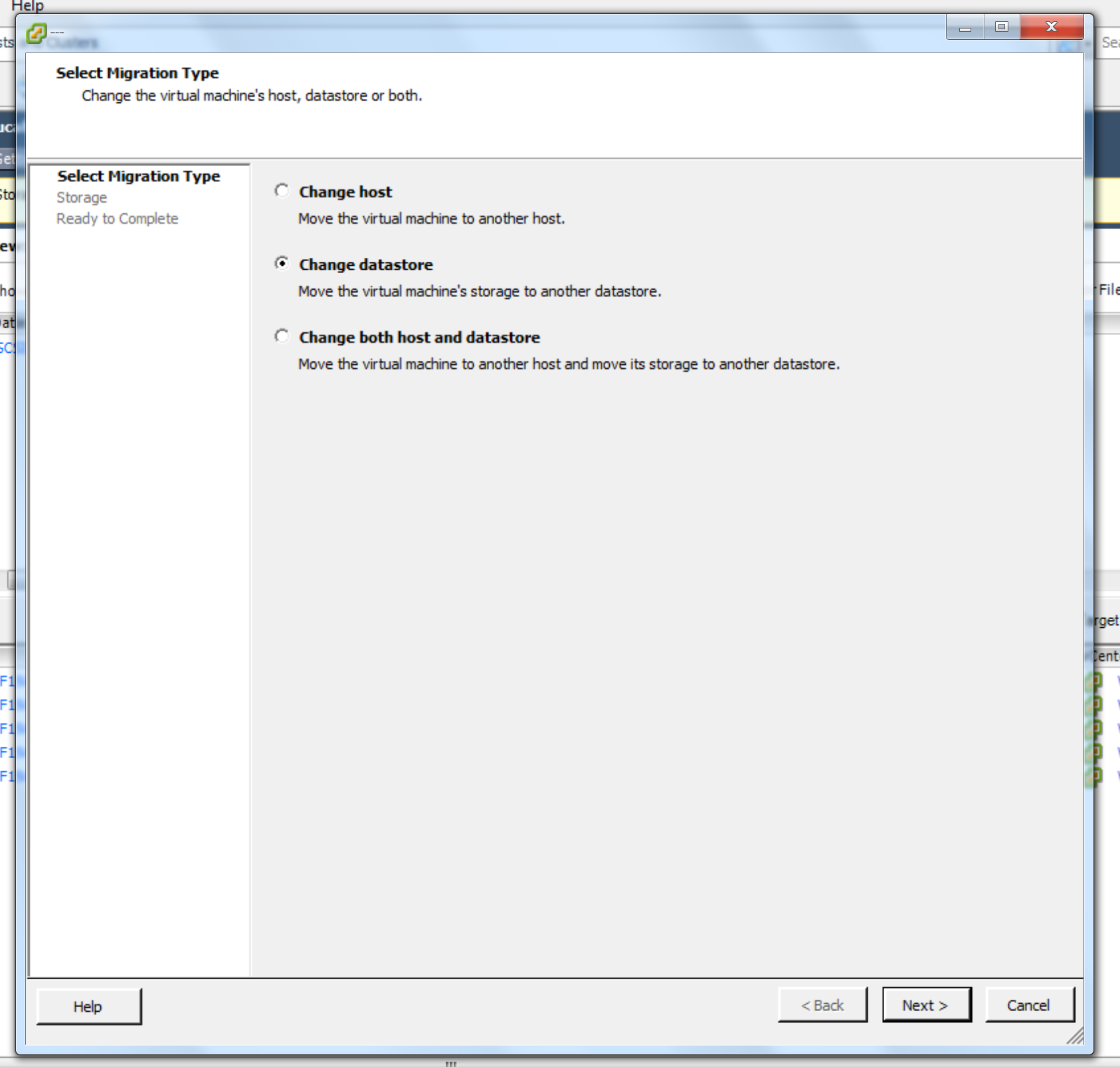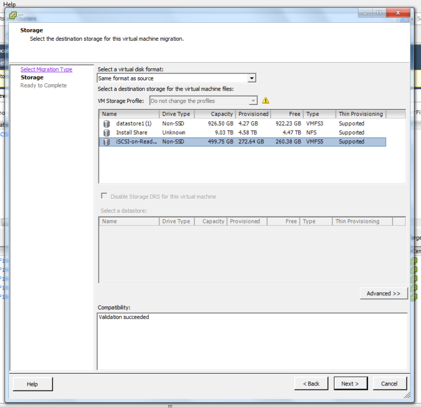 With iSCSI configured and the new datastore available VMs can now easily be migrated over in the usual way by highlighting a VM, right-clicking, and selecting “migrate datastore”. The click-through is straightforward, selecting the target datastore and initiating the move: