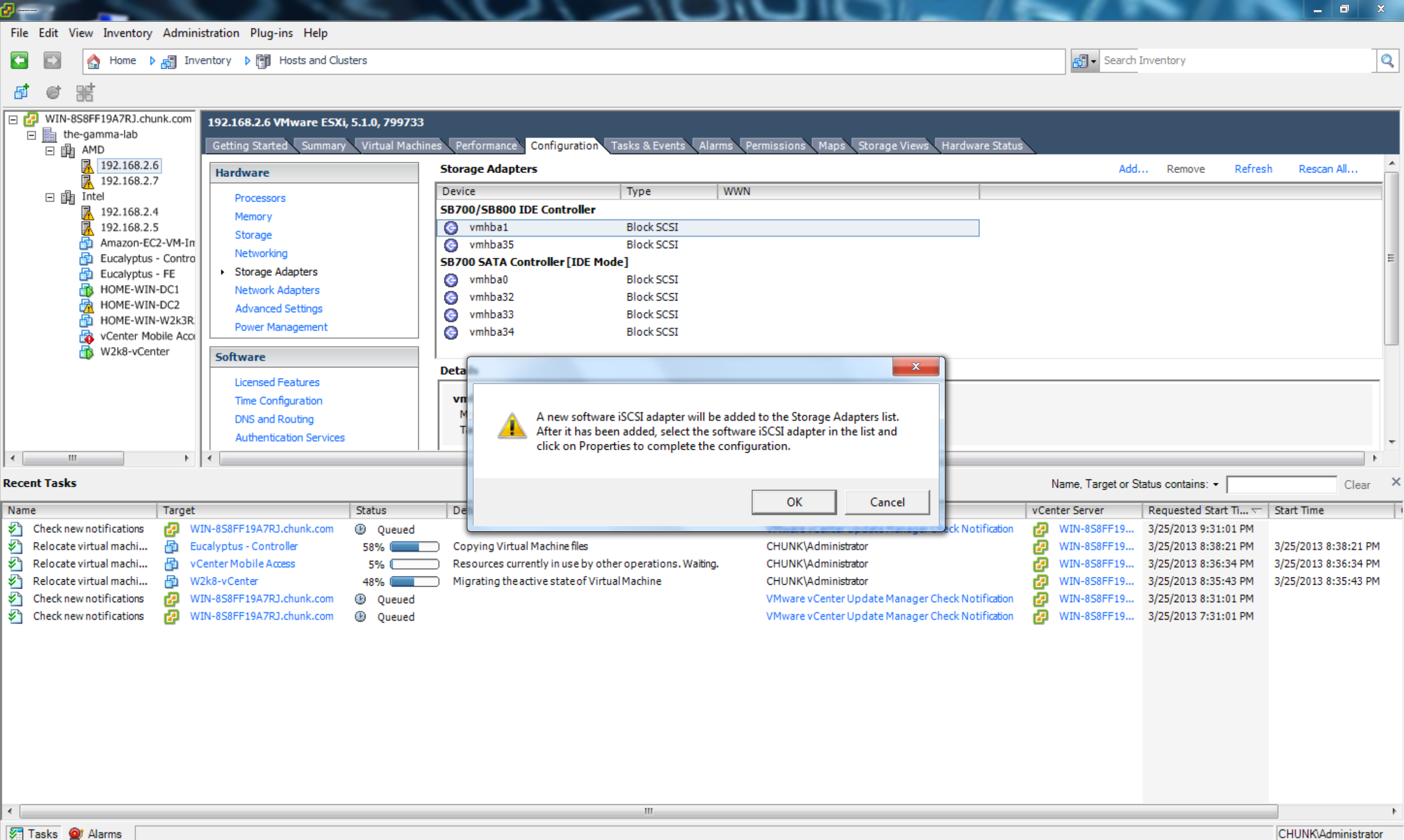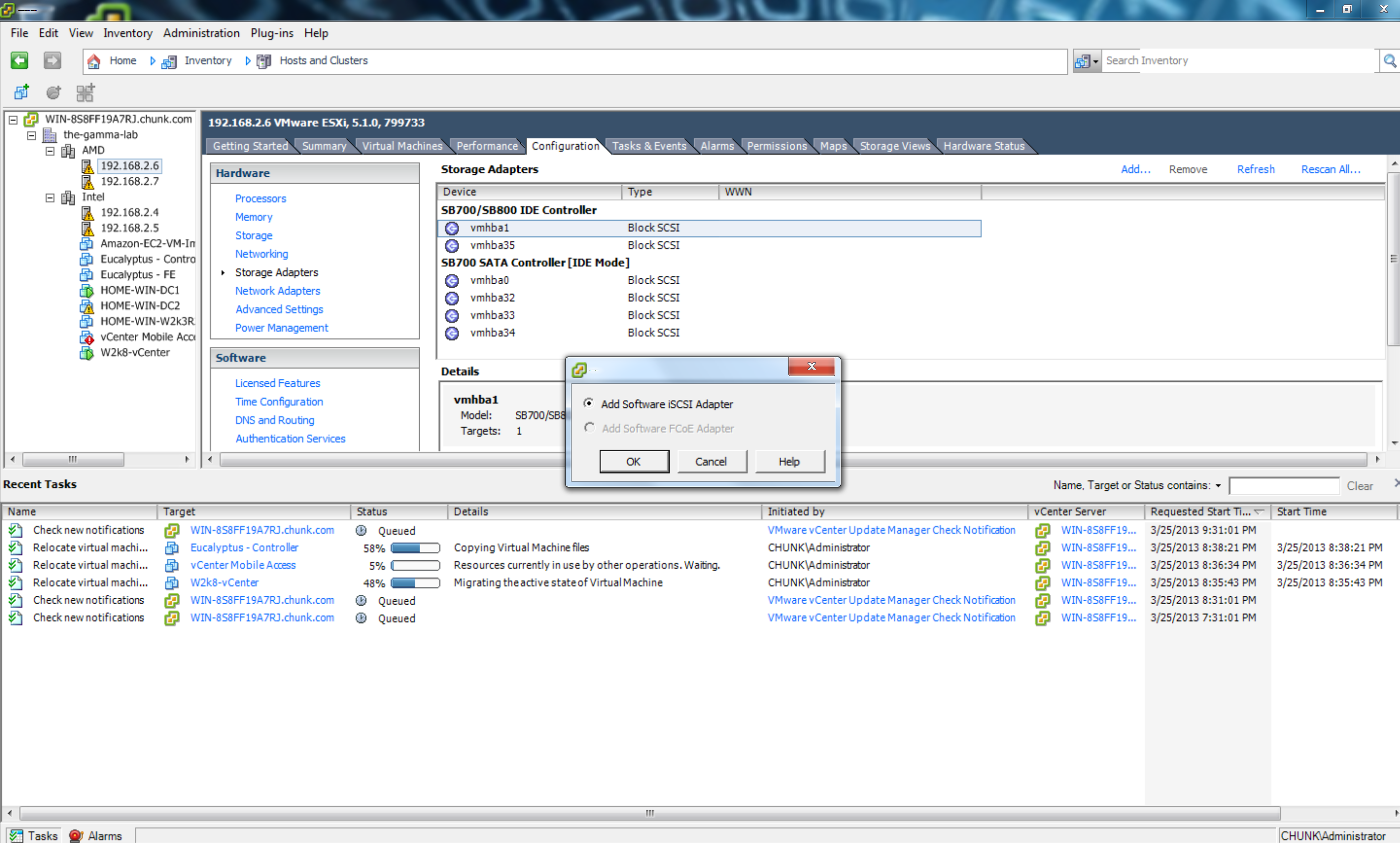 Once a target and associated LUN(s) have been created, it is time to configure some hosts to access it (initiators in iSCSI terminology). In vCenter, the way to initiate this is to add a new Storage Adapter. In vSphere/vCenter 5.1, the iSCSI software adapter is part of the built-in support and can be added to the host capabilities by clicking “add” under the Storage Adapter section of the Configuration tab: