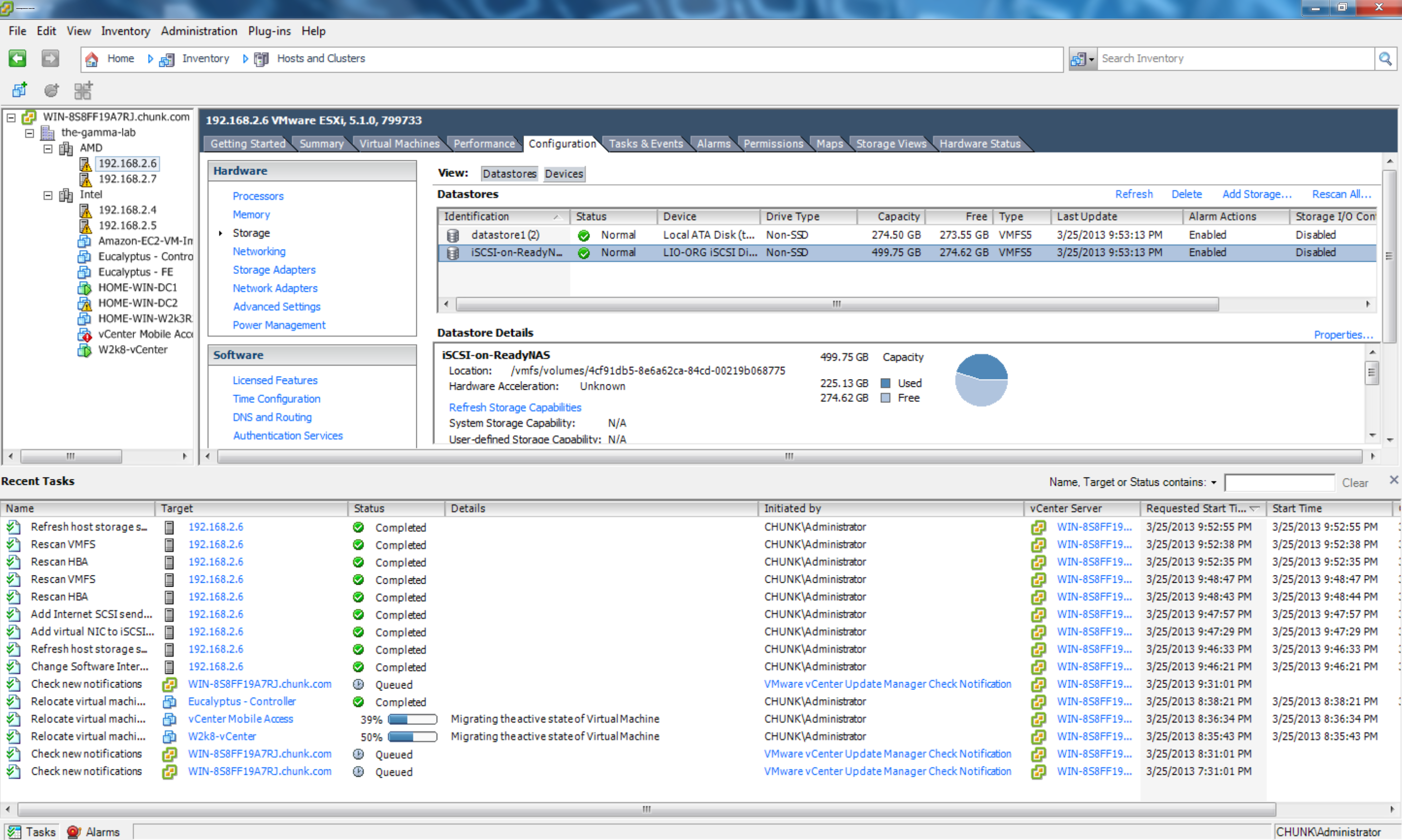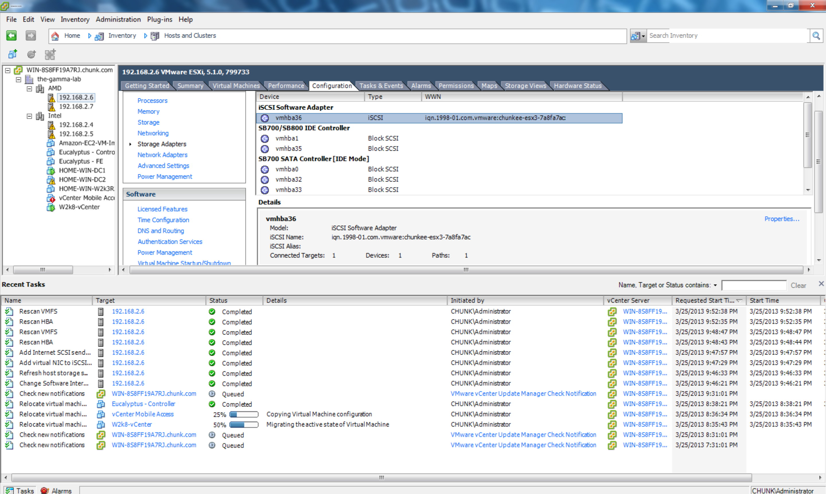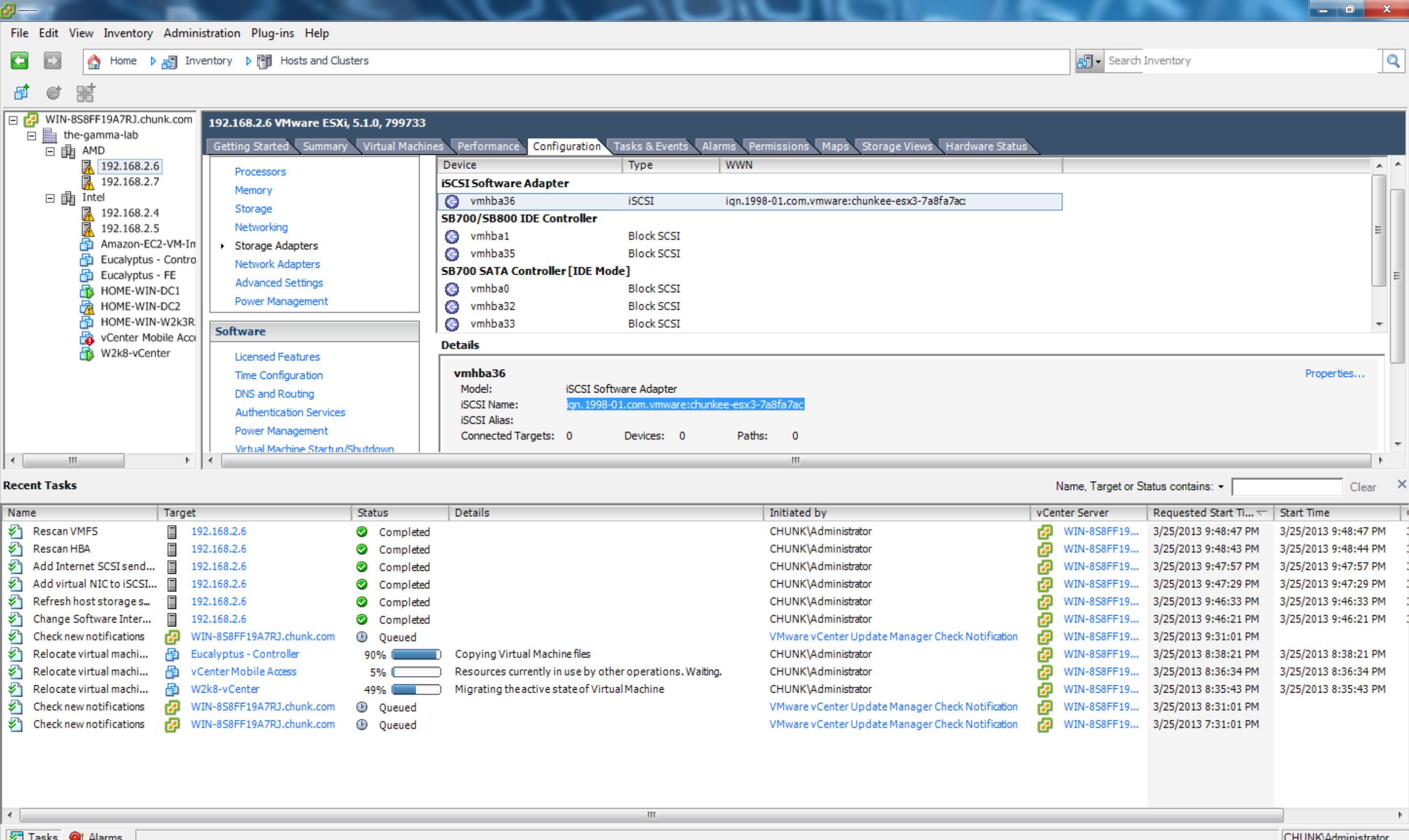 The move took quite a while (about 70 minutes) for my existing VMs owing to the fact that the network is only 1Gb/s and there was about 100GB of data. With all hosts and the existing VM catalogue migrated to iSCSI the next step was to do some vCenter reconfiguration to accomodate the new hosts. Stay tuned for part IV!
