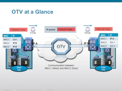OTV – Ciscos Open Transport Virtualization is pretty similar to VXLAN in it’s mission statement and its general architectural approach, and super different in terms of it’s implementation. The idea is the same – take an existing layer 2 domain (ethernet segment) and extend it across a wide area using a variety of different transport options (including layer 3 via IP) in essence creating an overlay network. OTV is extremely cool because it does some clever things to really enhance the agility of layer 2. One of the most important is that it shifts the business of layer 2 reachability determination from the dataplane (where layer 2 protocols normally live), to a control plane protocol (where routing table assembly happens in L3 protocols) The one huge area where the mission of OTV diverges from VXLAN is that OTV is meant to be end point agnostic and be an enhancement to the core network infrastructure that works transparently to the hosts that utilize it. VXLAN, conversely, is deeply embedded in the fabric of specifically vSphere hosts as an extension of the logical virtualization architecture. It doesn’t concern itself with transforming the physical network architecture, but rather enhancing the virtual one. Ironically, however, OTV doesn’t specifically address VLAN id proliferation by introducing a new isolation construct, which VXLAN does do. Interesting times! In the interest of fairness, a quick OTV picture: