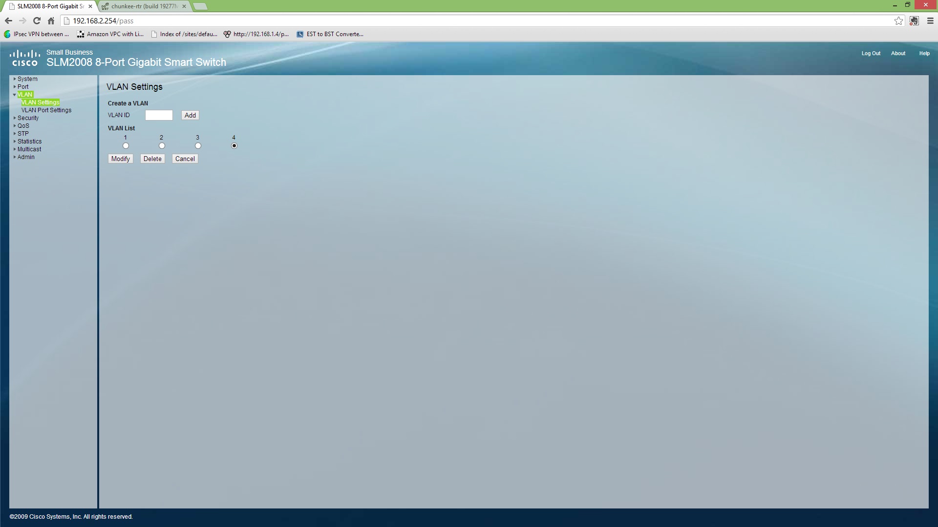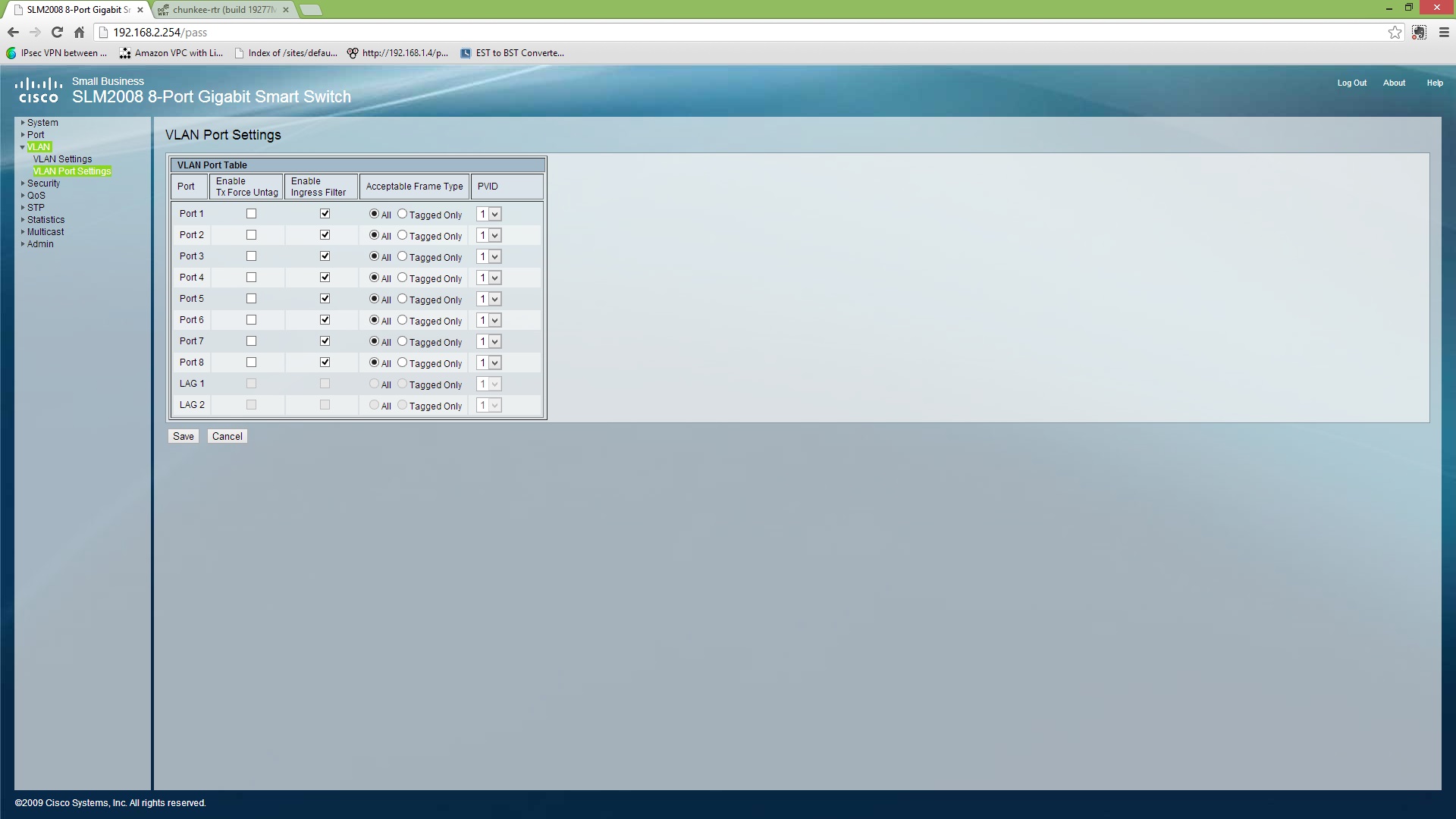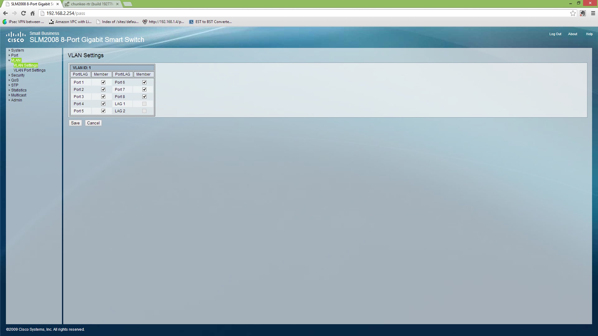 With DD-WRT configured, it is time to take a look at the (much easier) SLM2008 configuration. Most people probably don’t have this device, so I’ll just show the two relevant VLAN configuration pages for anyone curious how the GUI looks. First up the basic VLAN management screen where defining and deleting VLANs is as easy as entering some freeform text and clicking “add” (or “delete” as the case may be):