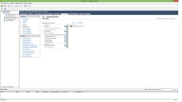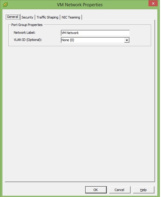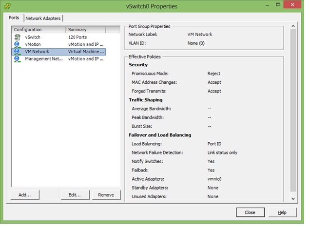 On the vSphere side, life is of course quite easy! I simply visited each host, dug down into it’s configuration, and in particular it’s network configuration, and adjusted the properties of the VM network port group of the appropriate vSwitch. Here we find the properties of the vSwitch: