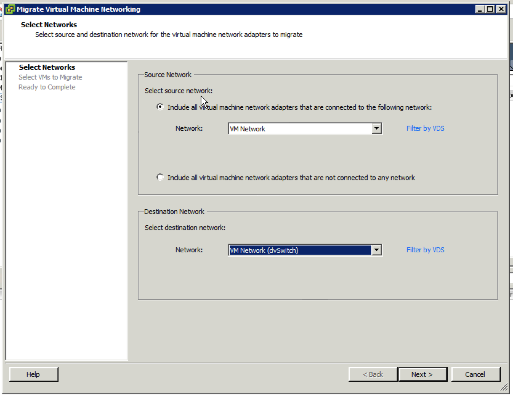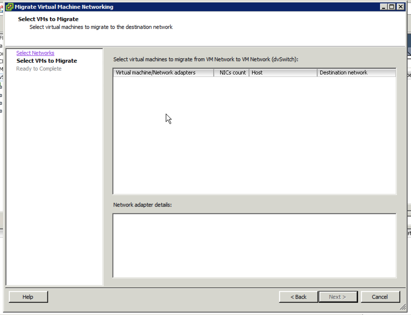 Next step is to select specific virtual machines within the legacy port group, or simply select all of them. Note that there are none showing up here because the migration was already completed by the time I remembered to take a screen grab!