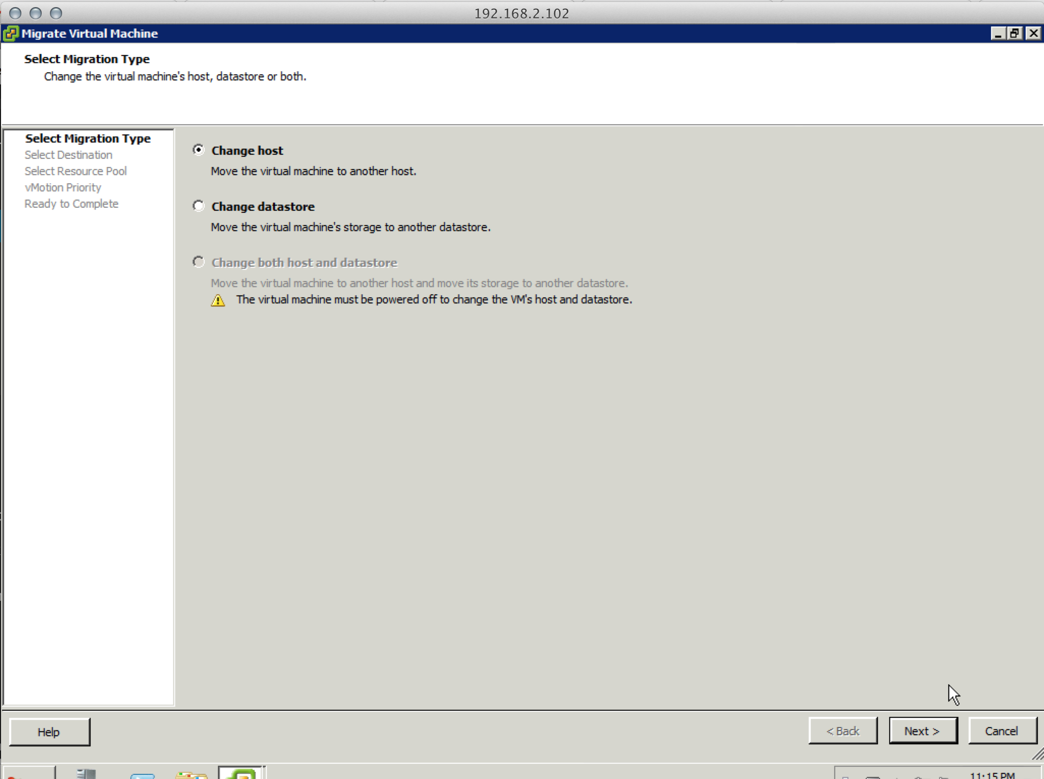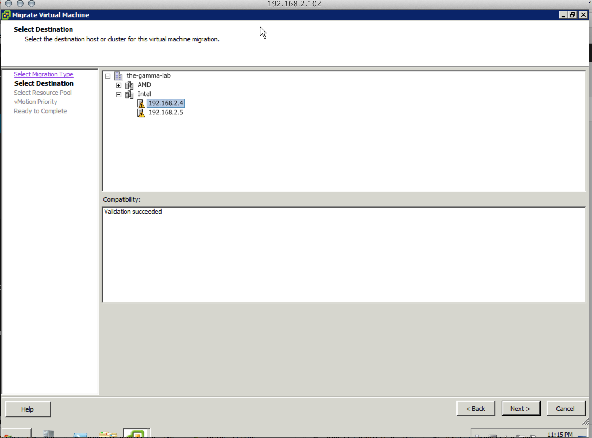 With the VM Network migrated over, I dropped into the switch interface again and created VLAN support for VLAN4 (my dedicated vMotion VLAN). The router was able to ping the hosts, so it was looking good, but the ultimate test of course is to perform the actual vMotion. vMotion is nothing new obviously. Right-click on a VM in a cluster and select Migrate, so we will walk through it stop motion photography style: