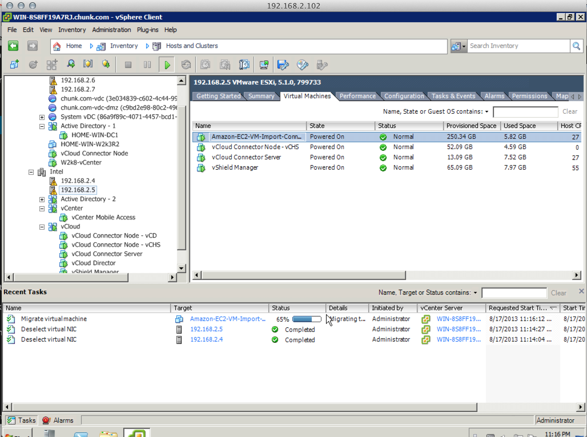 With the machines selected, you can go ahead, click next, and finish the staging to start the migration. In my case I moved 13 VMs at once and 12 of them went off without a hitch. One failed with an obscure error indicating that attempting to move the guest caused a loss of host connectivity and so the change was rolled back. Before attempting to figure that out I just gave it a second try and it worked immediately. A bit concerning, but possibly just an anomaly. Either way if this does come up, before worrying too much about it, do give the migration a second try.