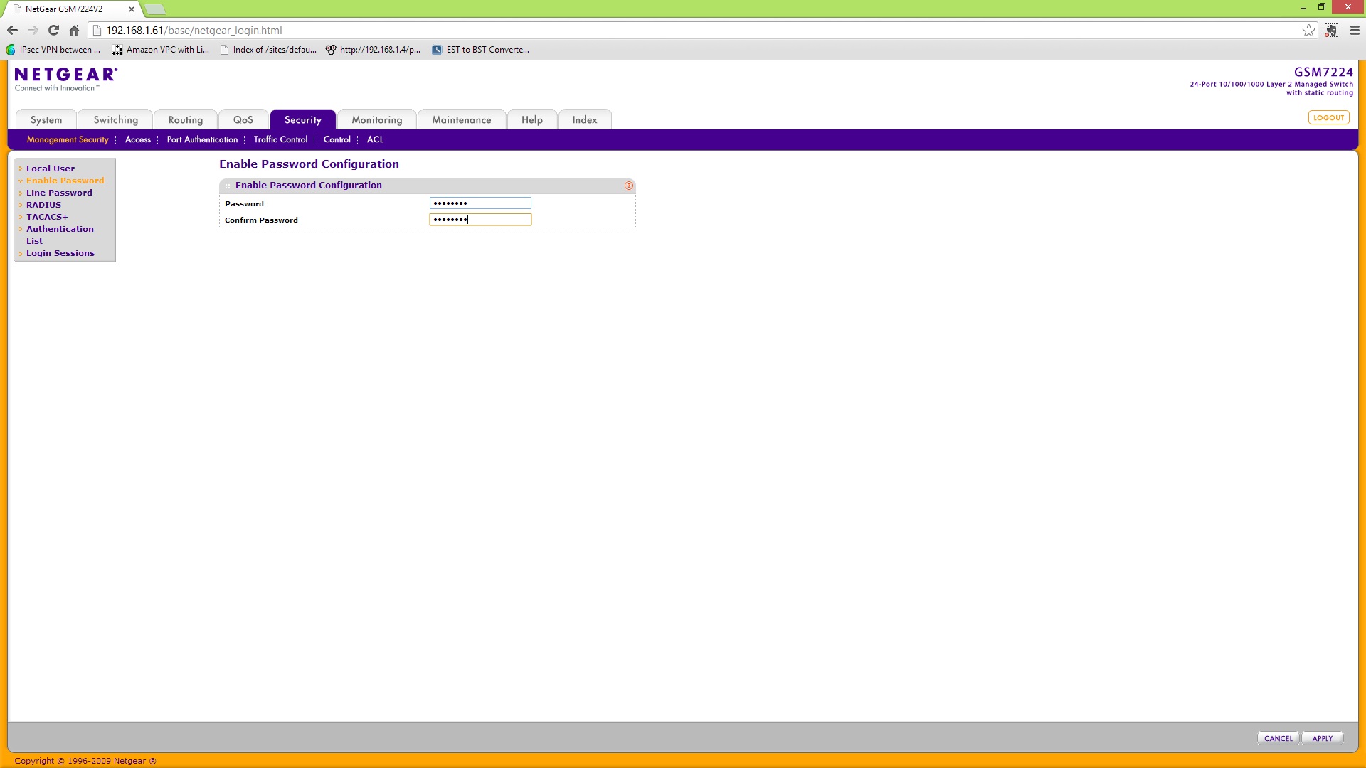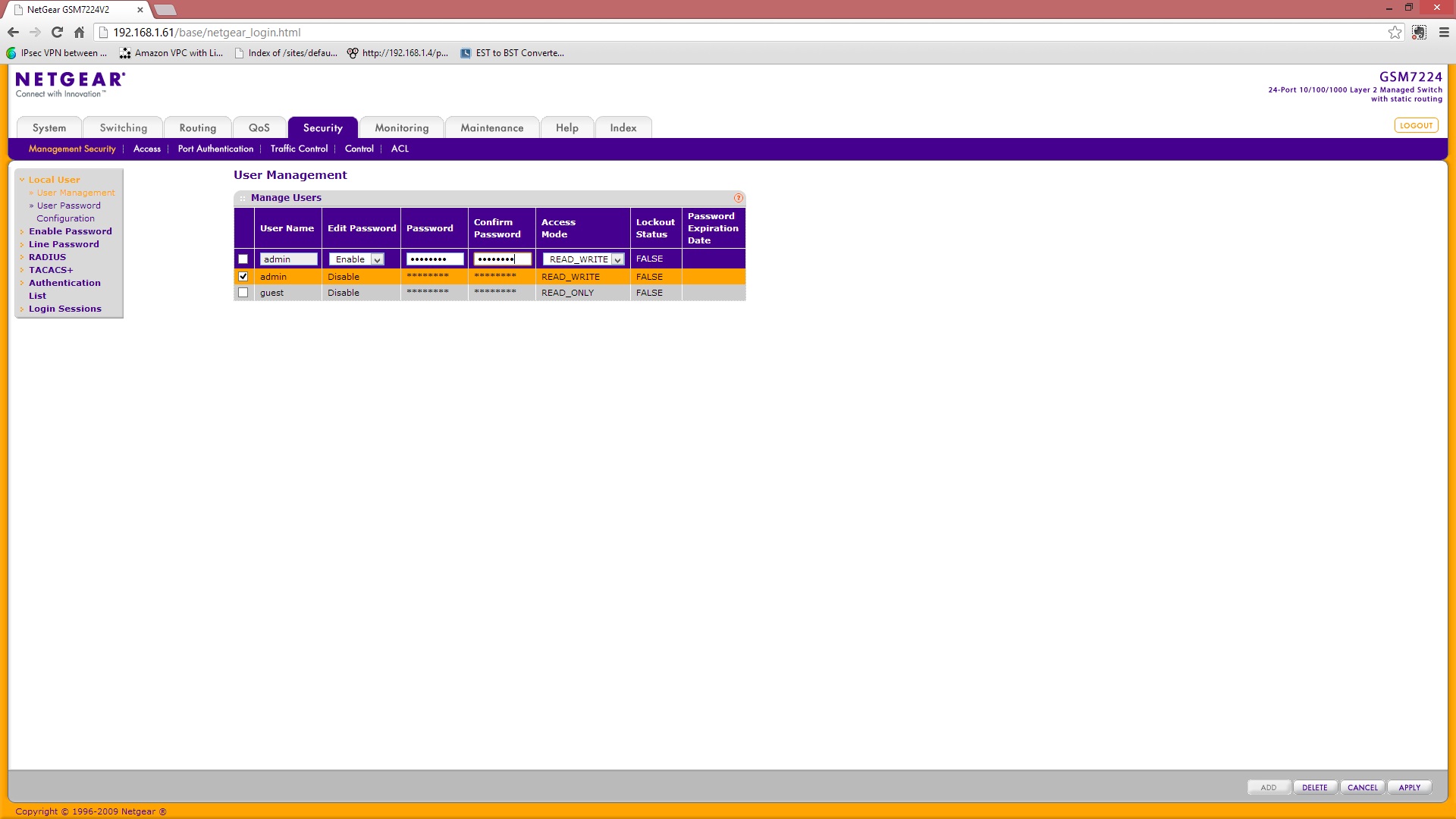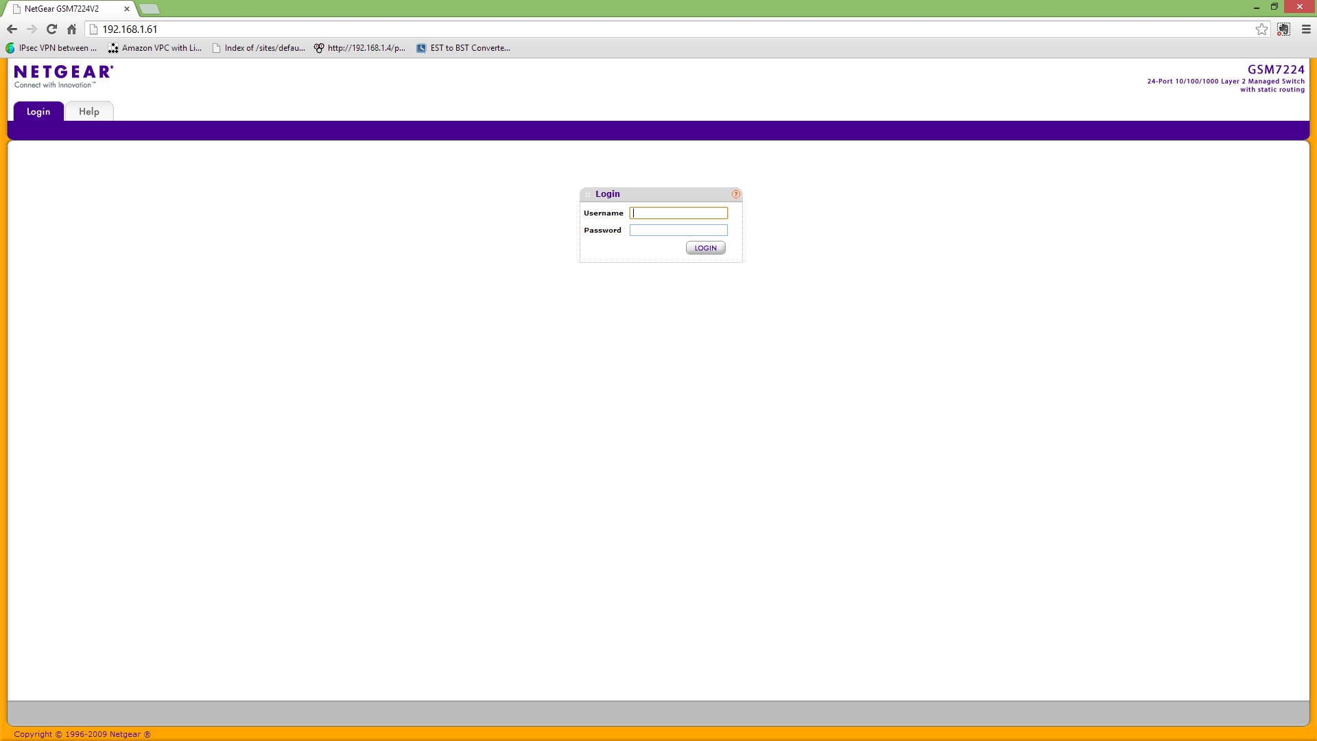 The GSM7224 is a DHCP enabled device, so a quick stop at my core production router provides me with the IP info and quick as that we’re in. The default login is admin and the default password is…. blank. So first step is to change that pronto: