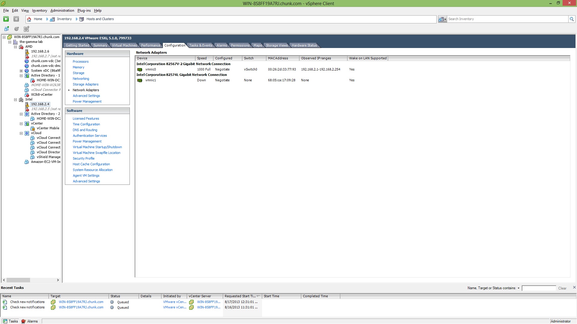 One interesting thing rinse/repeating the above for my hosts was that on the AMD boxes, the Intel NIC in the PCI-E slot took precedence over the onboard Realtek 8168 and became the default NIC. This took a few minutes of head scratching and “restart management network”ing at the console to figure out (“link down” is a clue!) A quick cable swap was enough to bring it online and ESXi was actually no worse for the wear. Not a surprise, but always nice when things work as expected!