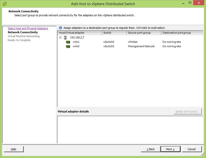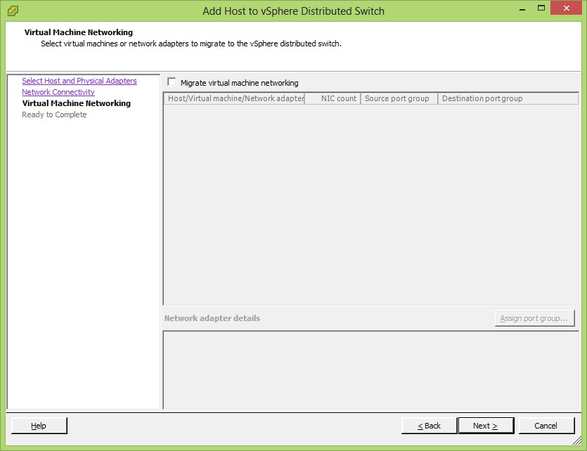 With no port groups tagged for migration there isn’t much to see here in the migration summary section. If we had selected port groups, we’d have the opportunity here to select individual virtual machines or network adapters attached to those port groups and have the opportunity to move them around: