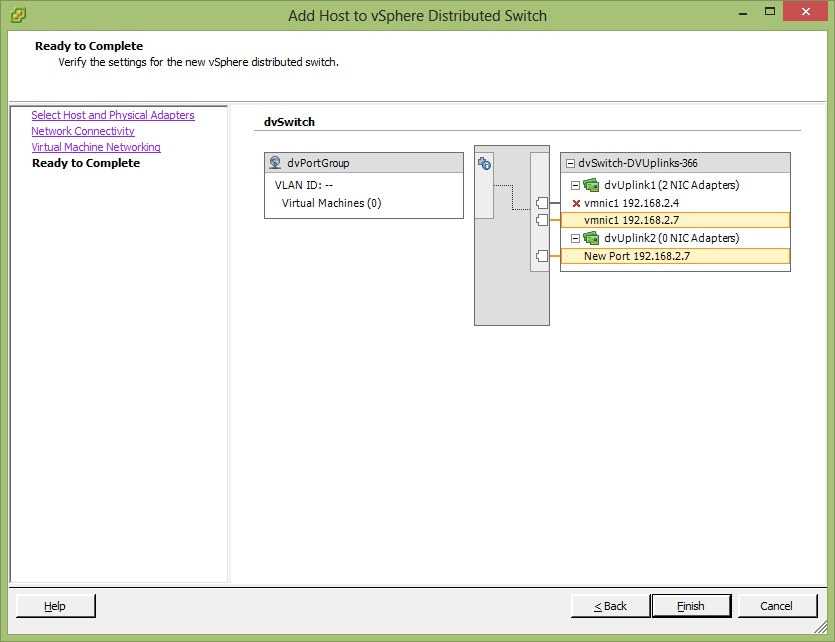 The next step is to select port groups on that host to migrate. Since we are leaving the existing vSS configuration alone, we do not create a migration mapping for any of the existing port groups (that will come later on in the network reconfig). For now we are just adding an unbound and unused pNIC to the vDS: