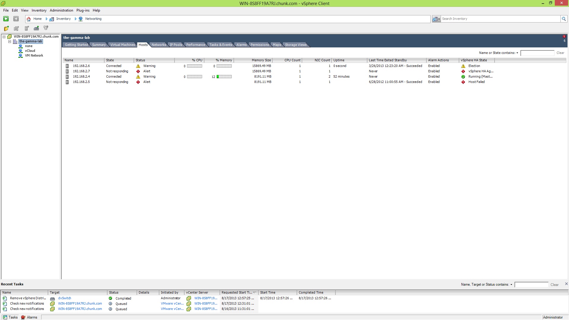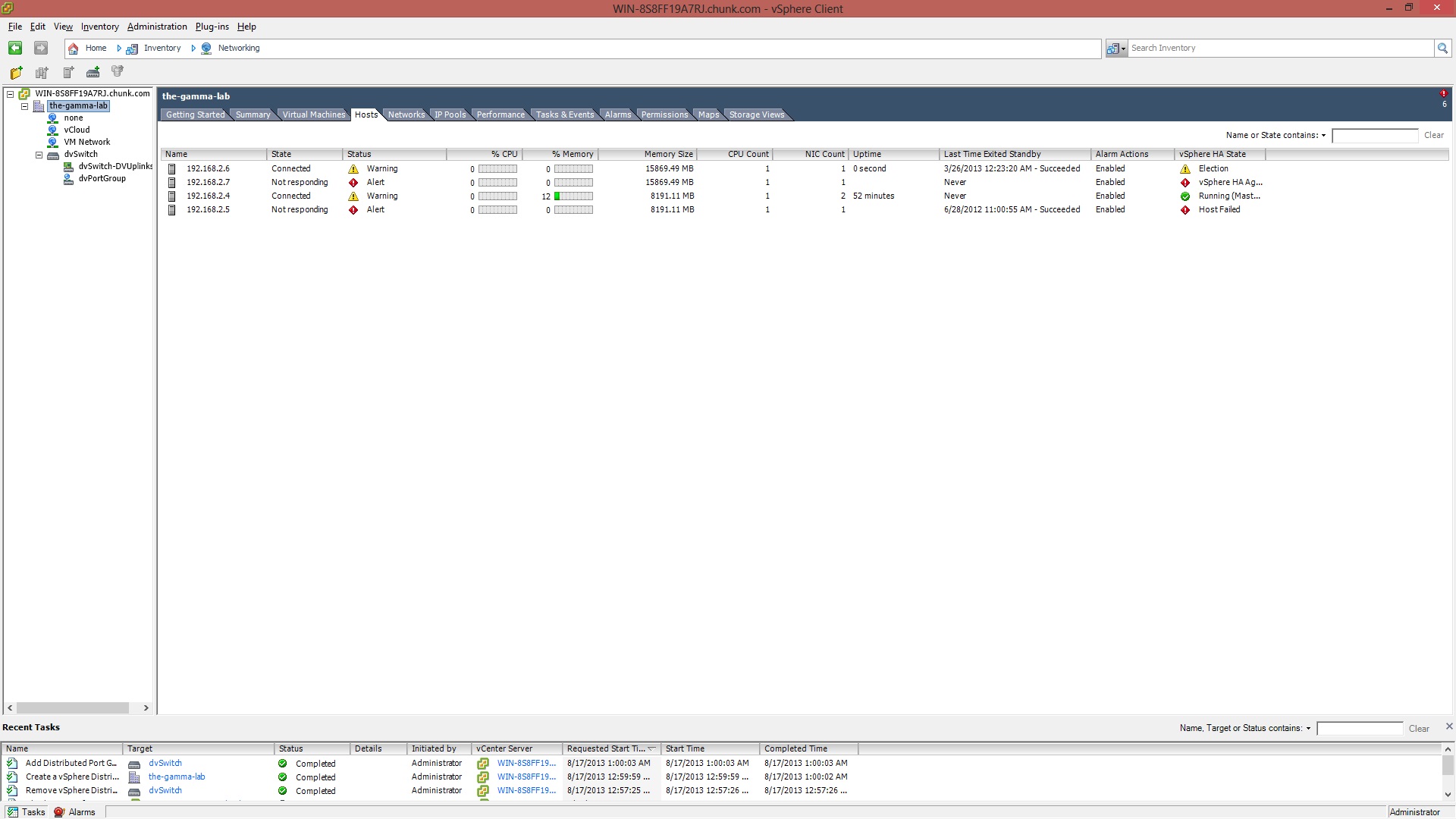 With the new vDS creation task queued, we are deposited back into the vCenter client networking inventory section where we will see the new virtual distributed switch, and it’s default port groups, turn up quite quickly: