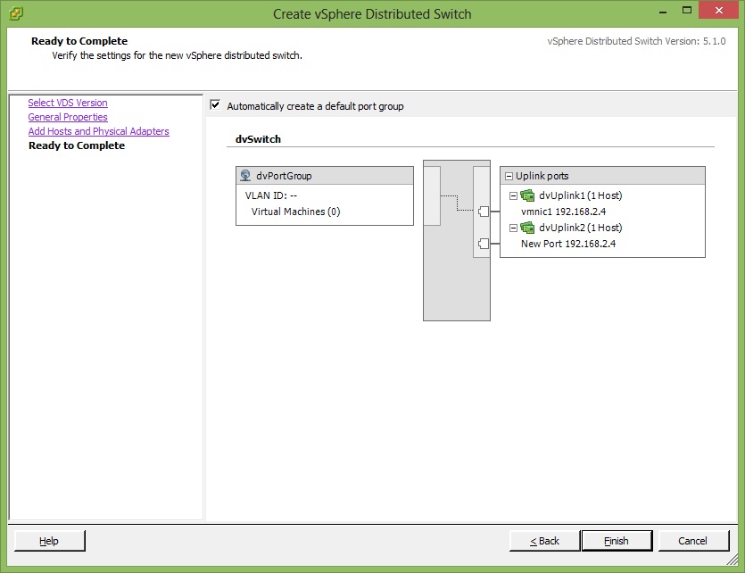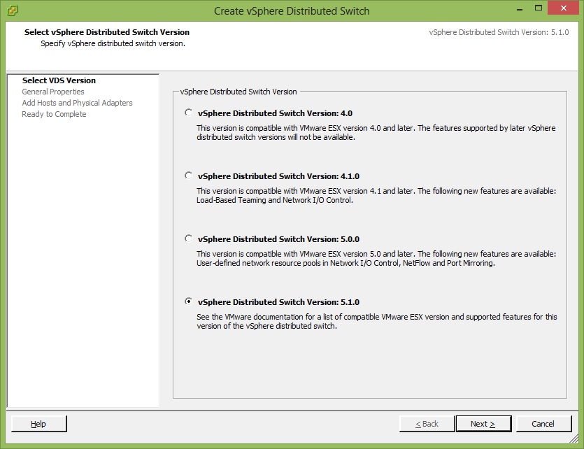 The Create vSphere Distributed Switch wizard is surprisingly straightforward. First we select the vDS version. In this case we’ll go with current (5.1.0) since there are no legacy hosts in the lab: