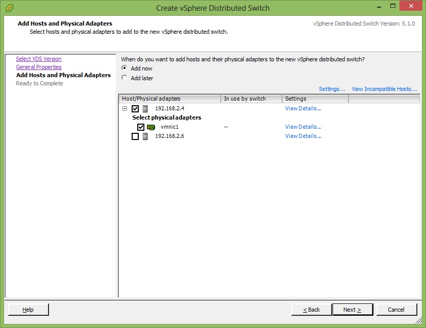 Next we have the option to add hosts to the vDS we are creating. Note that this is optional. A host must have a free NIC to appear here. The great news is that you can select “Add later”. In those single NIC scenarios, that is the option you would go with and then once the vDS was created, migrate each host in at the host level (rather than assigning an individual NIC at a time to the vDS). Once again, this is covered in the Chad King video linked earlier: