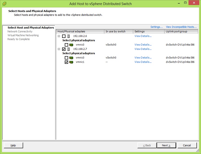 The first step is actual host selection. We see that we can now add our original vCenter host which still only has a single NIC. This would be our first stop after initially creating a vDS and choosing “add later” for host selection and is where we would begin our single NIC host migration. In this case, we are going to focus on our newly dual-NIC host and select only the NIC that is not currently bound to a vSwitch: