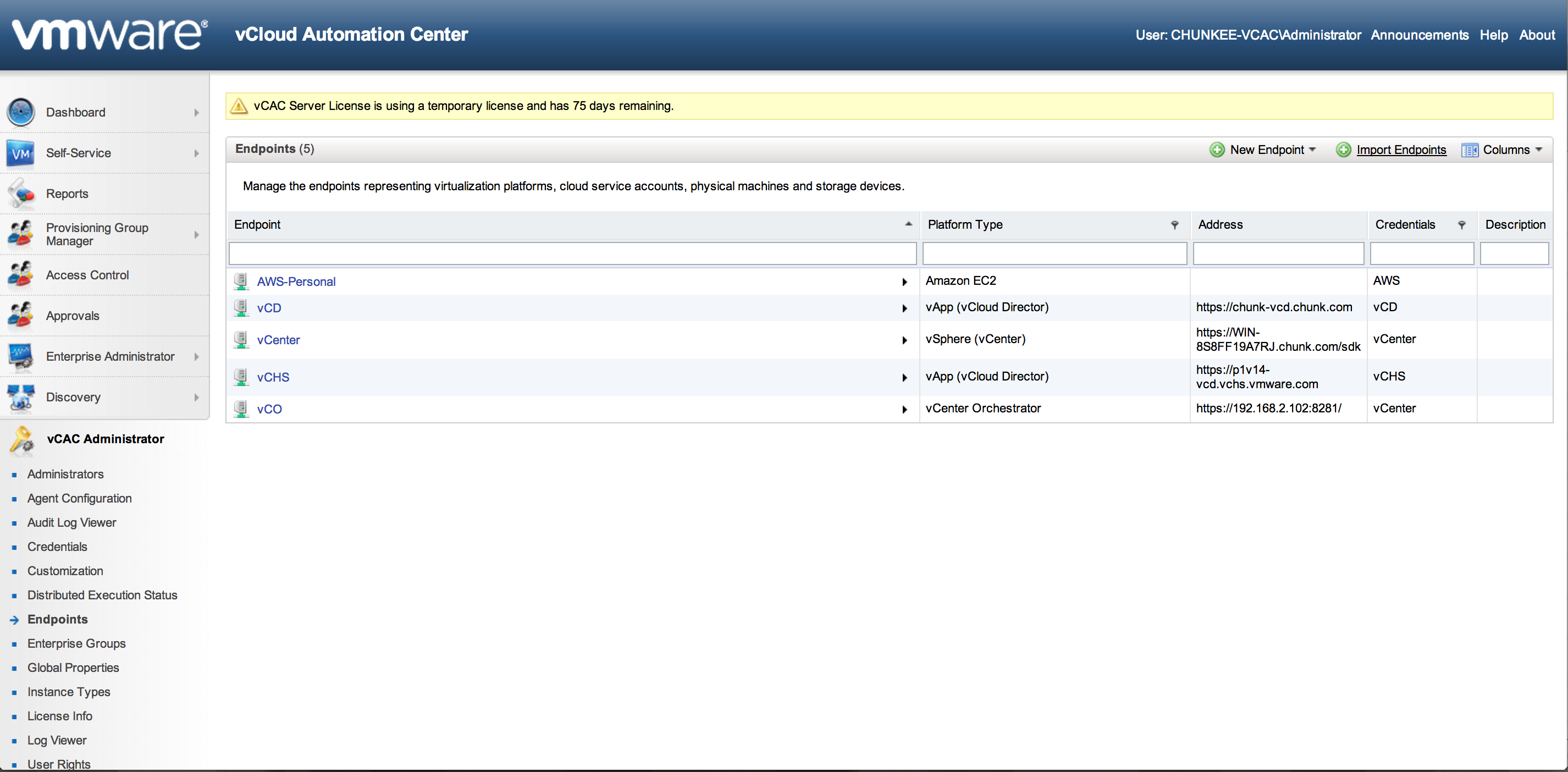 - Endpoints: Everything begins with the endpoints! (sorry) Endpoints in vCAC are the connected systems that vCAC will orchestrate. They can be either physical (managed via the WMI agents), virtual (managed via the vCAC agents installed and configured to connect to various hypervisors during the install phase) or they can be “Cloud”. Out of the box vCAC can connect to vCloud Director (imagine if that weren’t there?) and, drumroll, EC2. To get started creating, select vCAC Administrator from the portal main menu and then select Endpoints. Here is a shot of my configured endpoints: