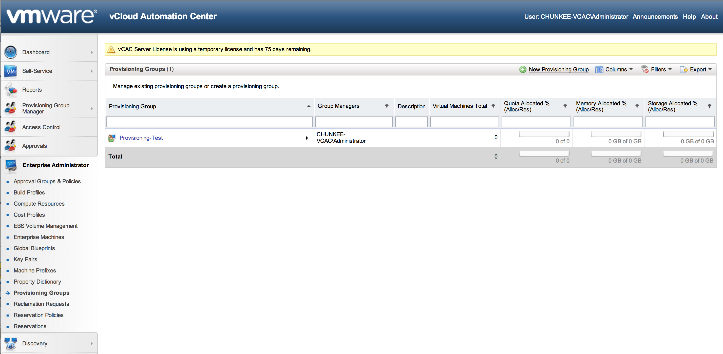 - Provisioning Groups: Provisioning Groups are a collection of machine consumers (end users that are entitled to request resources). To request machines, a vCAC user must belong to at least one provisioning group. Each group has access to a set of local blueprints used to request machines. Establishing provisioning groups, and the baseline access control they represent, is a pre-requisite step for setting up the resource consumption constructs. Here is a look at my provisioning group list, followed by the dialog required to set one up: