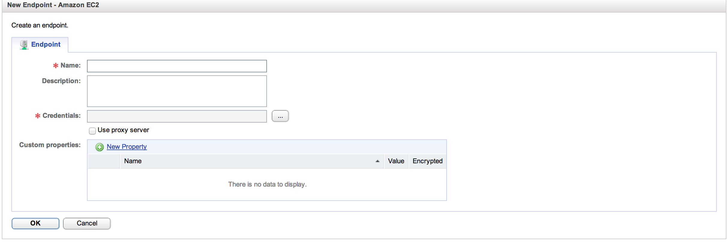 Here you can see configured agents for EC2 (AWS-Personal), vCloud Director (vCD), vCenter (vCenter), vCloud Hybrid Service (vCHS – more on this in a future entry) and vCenter Orchestrator (vCO – more on this in the future as well – vCAC to vCO is an interesting topic). Sticking with the AWS case, to setup an AWS endpoint you need some basic info. Click on “New Endpoint”, select “Cloud” and “EC2” and you will see the following: