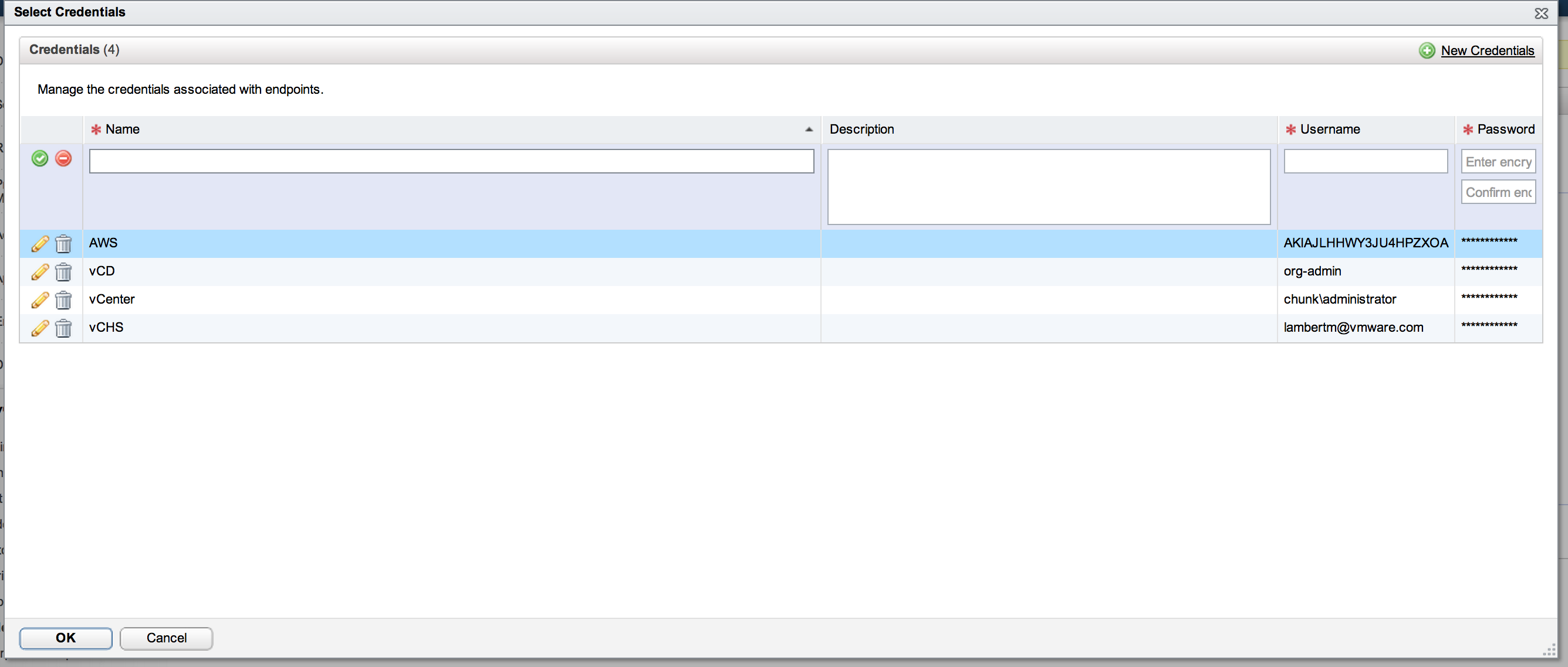 Name is straightforward; just use a familiar name that makes sense. Credentials is where it gets interesting. vCAC managers credentials as separate entities from the services those credentials entitle. Let’s take a look at the credentials dialog that will appear after hitting the ellipses: