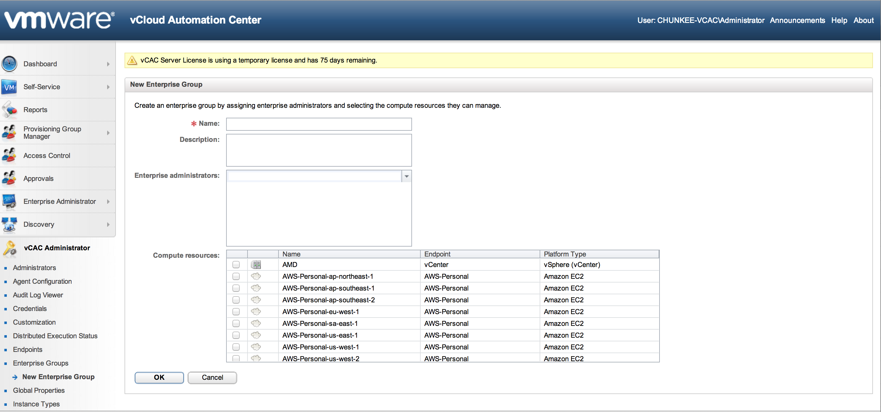 - Enterprise Groups: Enterprise Groups are collections of resources provided by the end points. Once an end point has been successfully initialized, it’s time to assign its resources to an Enterprise Group. Here is a shot of my configured groups: