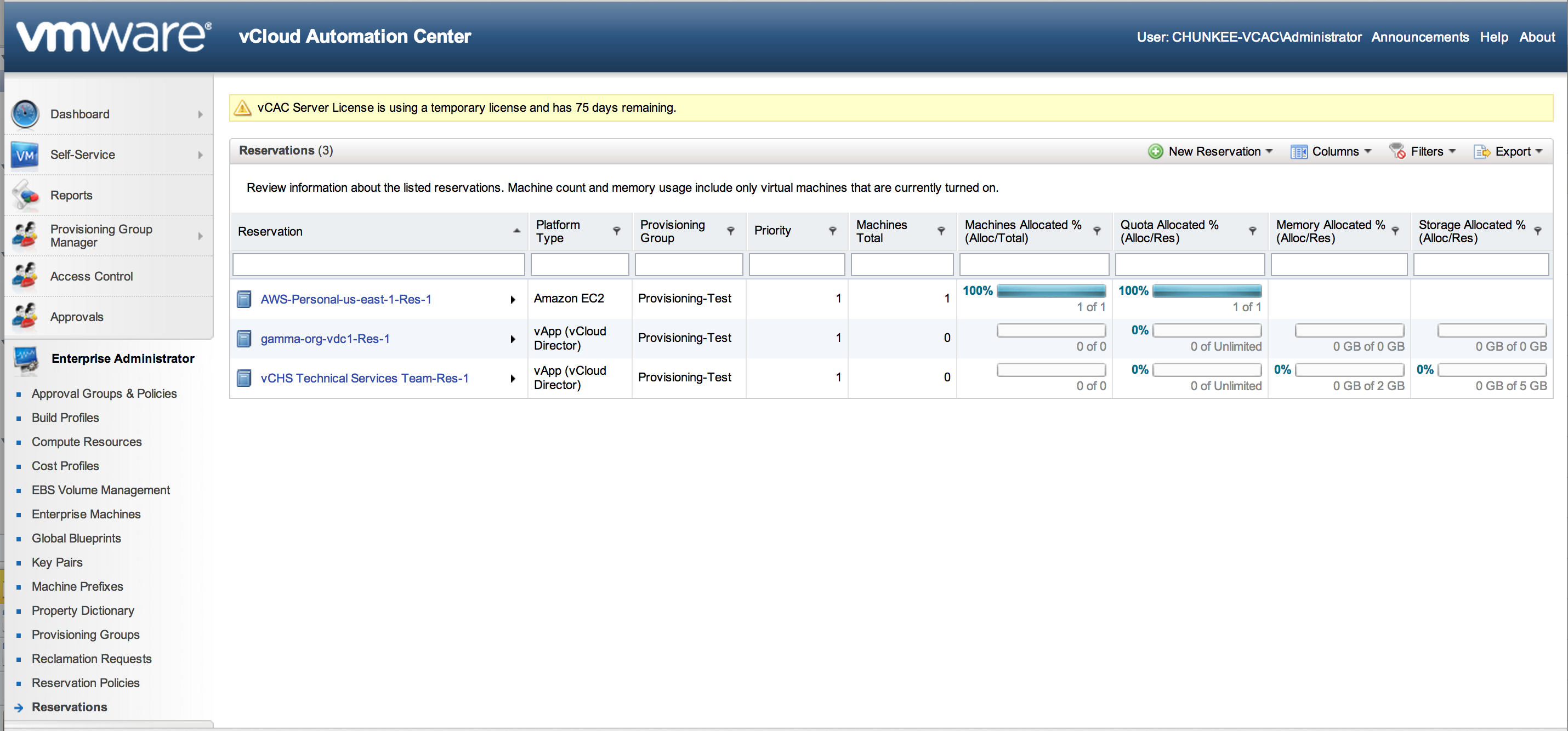 To get started, click “New Reservation”. Note below that “provisioning group” (who is allowed to request resources from this reservation” is a required component for creating the reservation. So in this case we have a clear answer to the chicken and egg problem! Create the entitlement first, then create what they are being entitled to. Here is a shot of my configured reservations: