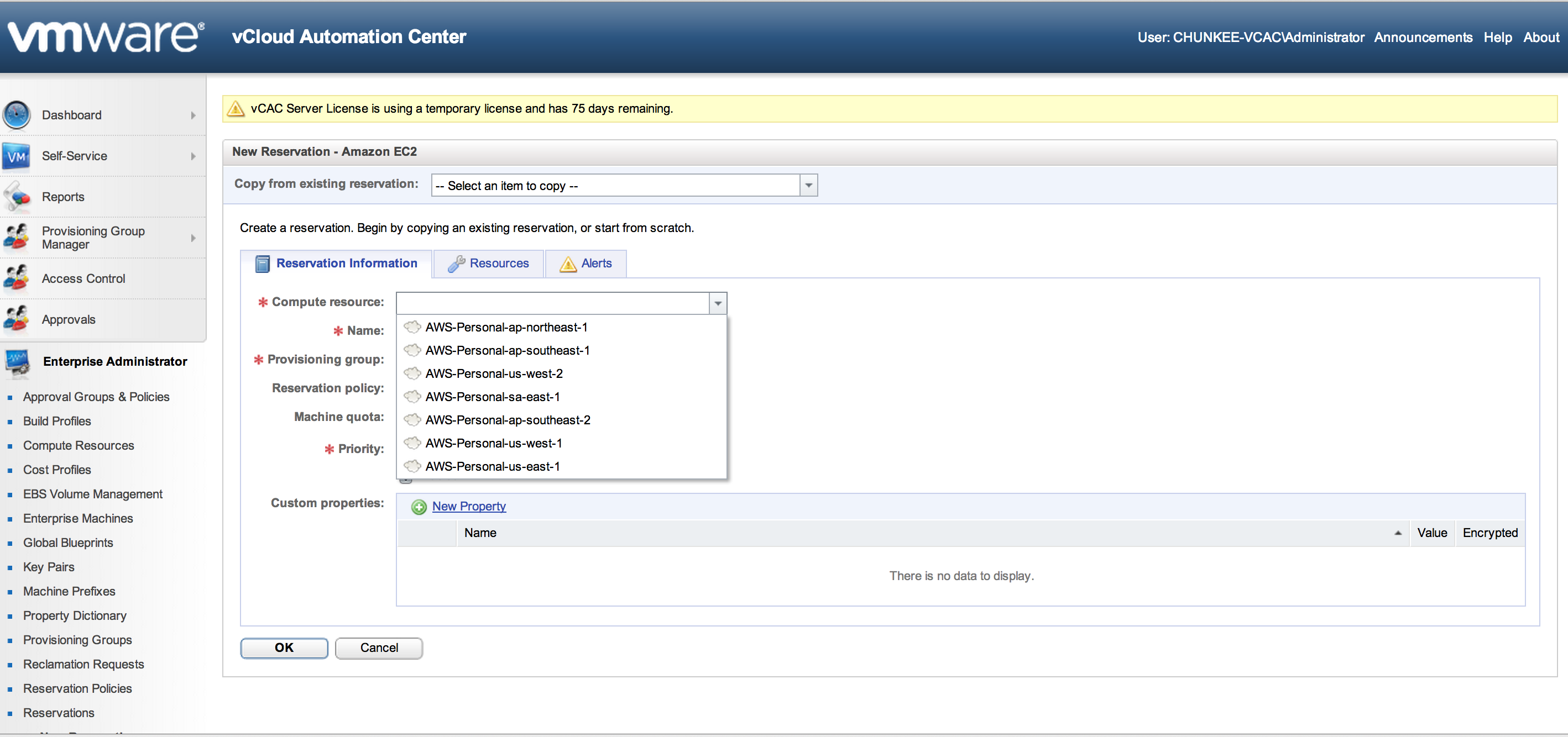 To get started, click “New Reservation” and select the appropriate resource pool (either a cloud, physical or virtual end point) In our case we choose “Cloud” and “EC2”: