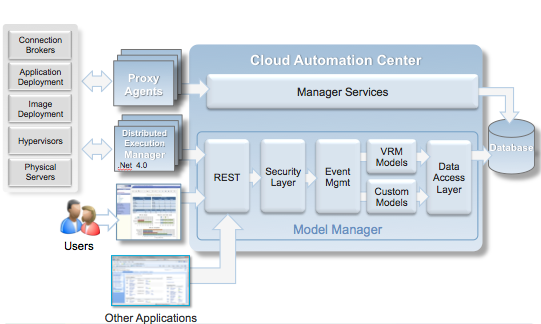 - Model Manager: the vCAC Model Manager is essentially the command and control of the vCAC architecture. Automation systems at their core are based on an interrelated collection of defined workflows (operations to be performed) and interfaces (connections to systems on which those operations are being performed). Approvals, access control, auditing and presentation are all components of this foundational structure. The Model Manager is broken into two components, a web service and a data access component. These two components are always installed together. Not surprisingly the basic building block of the Model Manager is called a “model” and is made up of the following elements: