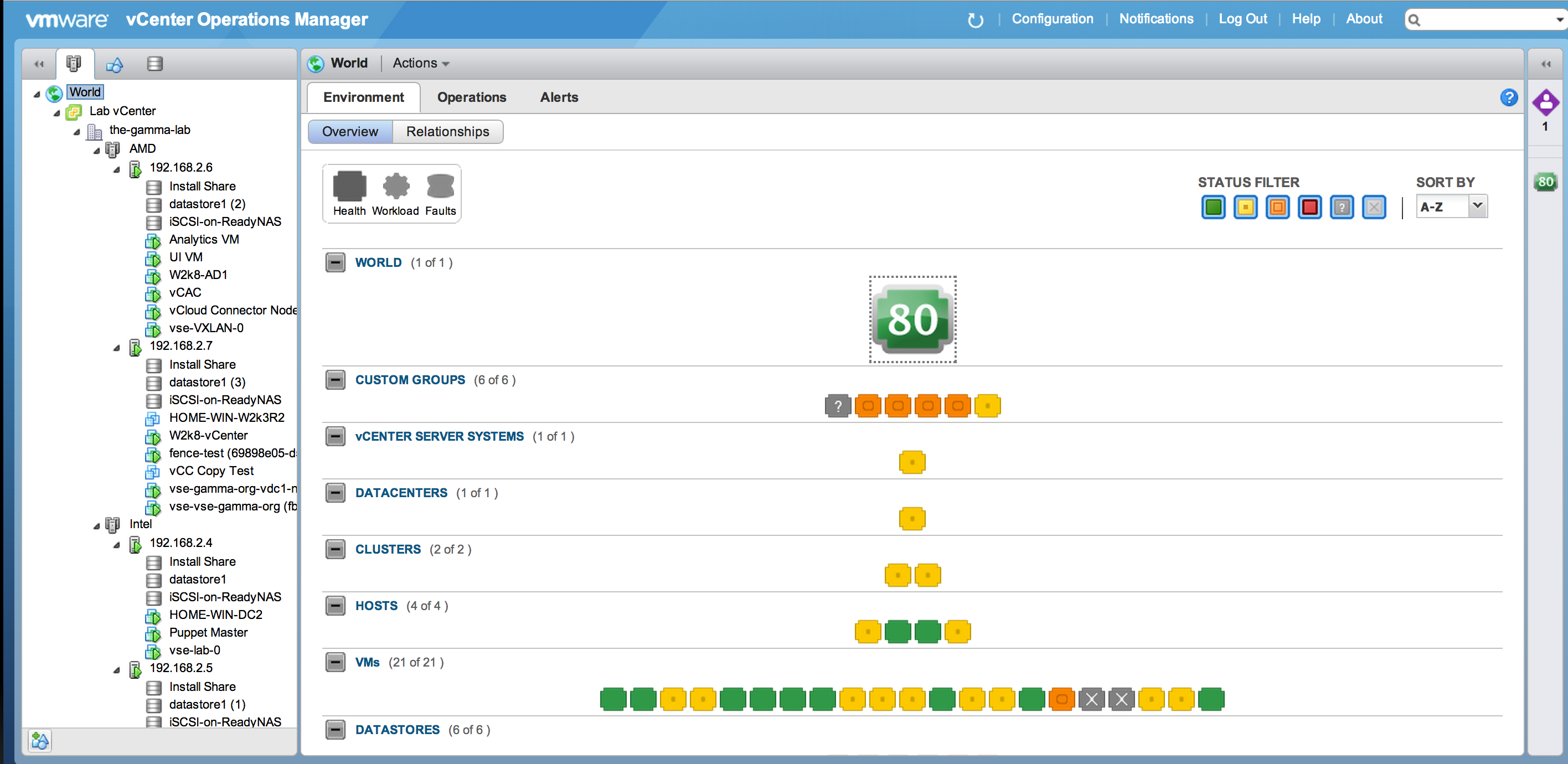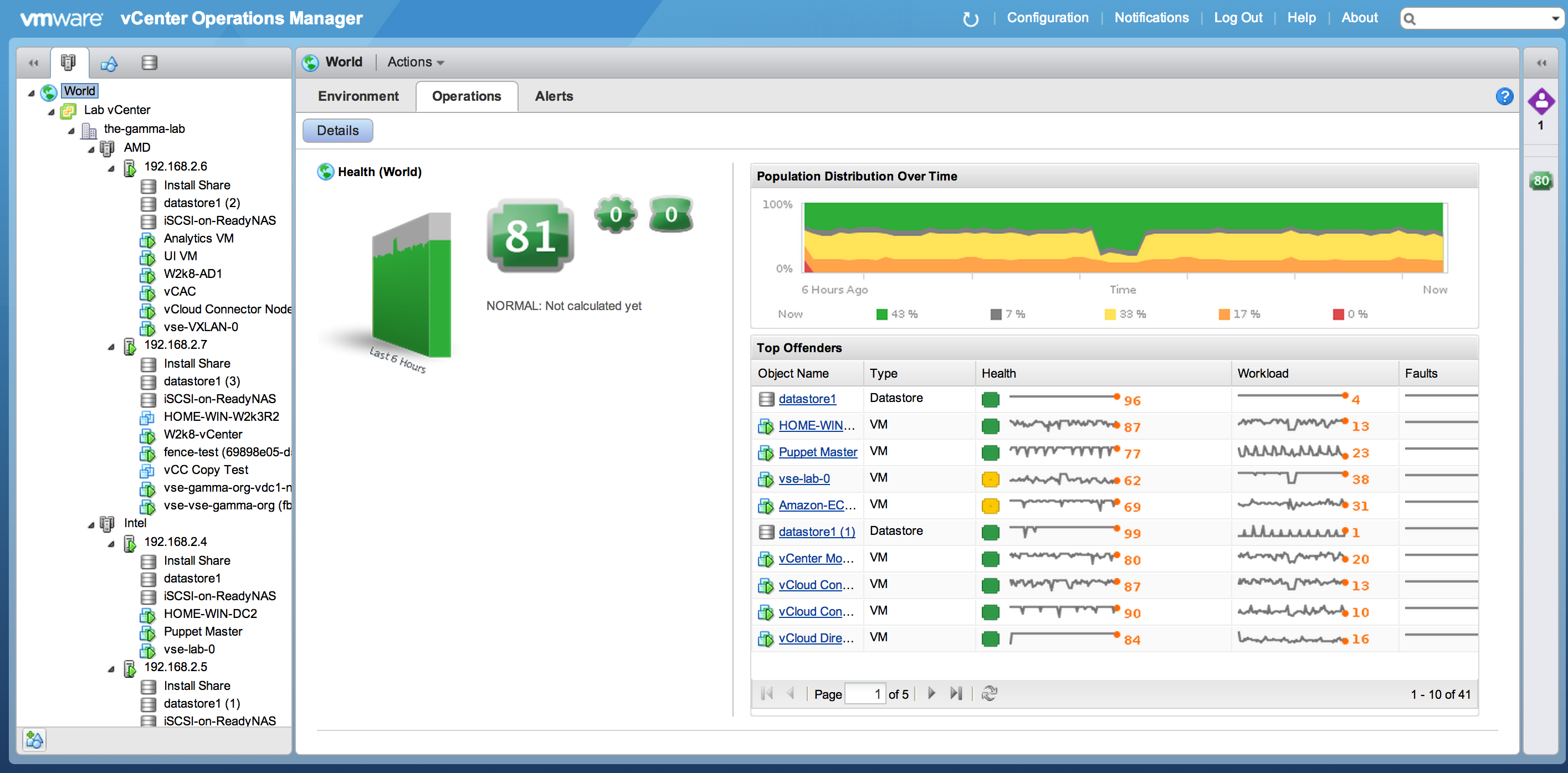 The good news is that the tooling in the virtualization space continues to get better. Last entry I walked through some of what can be done with vCAC in terms of a broader ITSM 2.0 context (just scratching the surface really). This entry I decided to highlight another great tool in the VMware arsenal and that is around the management and monitoring space – vCenter Operations. I’ll be using this entry to take a deeper dive into what you can do with vCOPs, and also exploring some cloud based scenarios, but for now, just a teaser of vCOPs up and running in the lab: