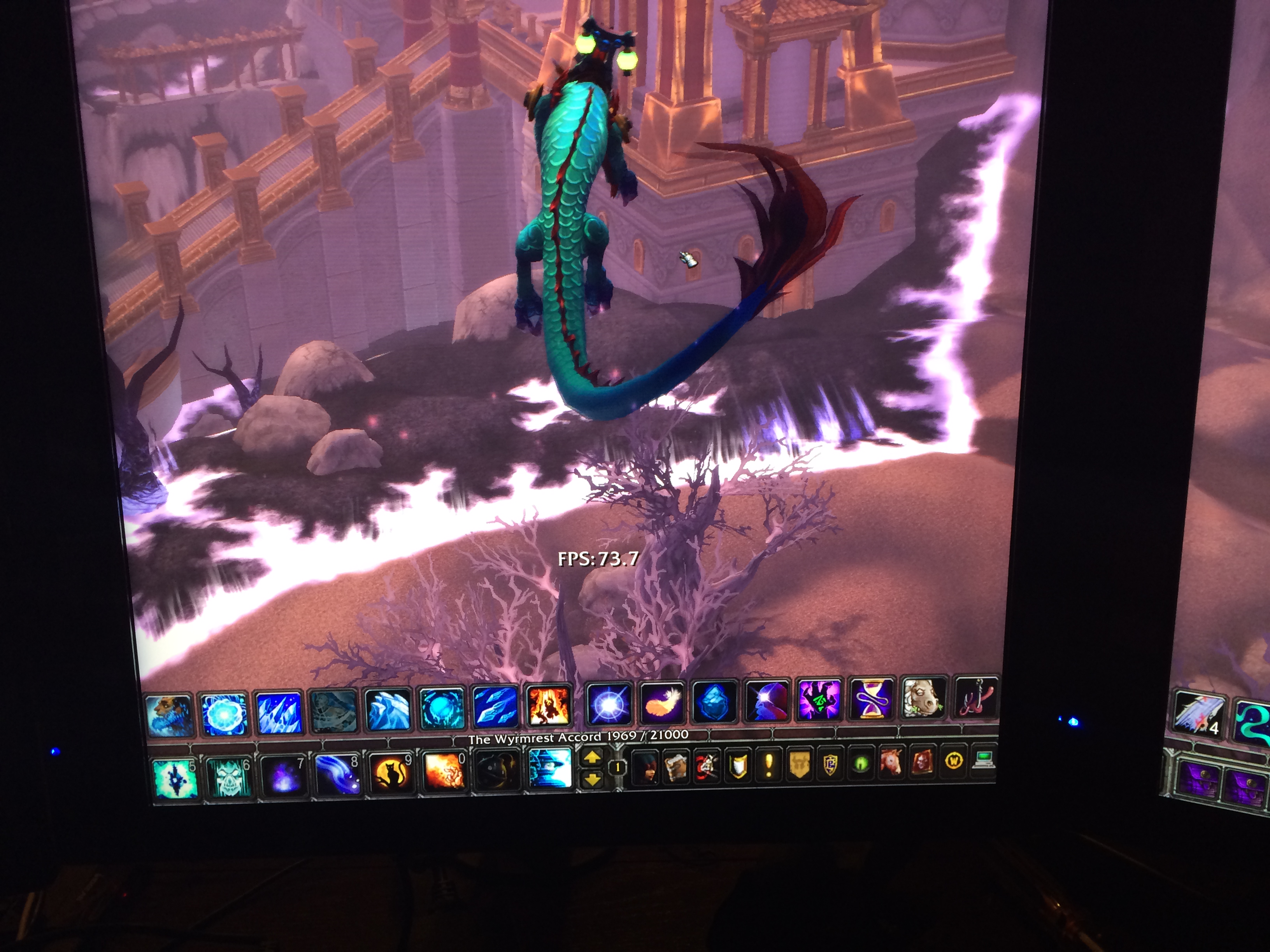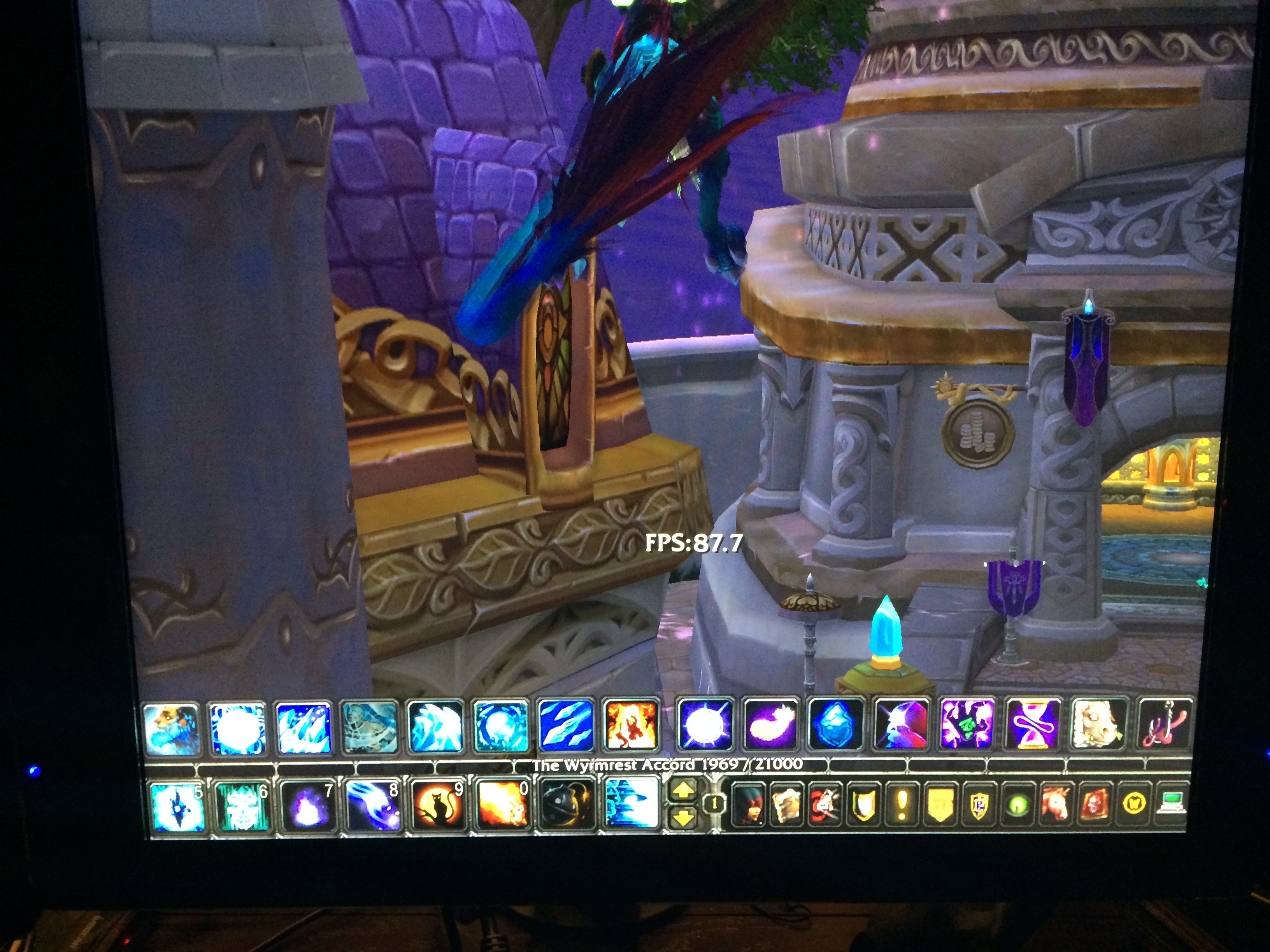 You’ll notice there the lovely view of the skies above Dalaran. Sure enough, I decided that I would give World of Warcraft a test drive first! Looking sharp in portrait with all settings at my usual (Ultra, with literally everything maxed out save shadows which are dialed back one tick to high), the framerate above Dalaran was rock solid. Here is a closer look: