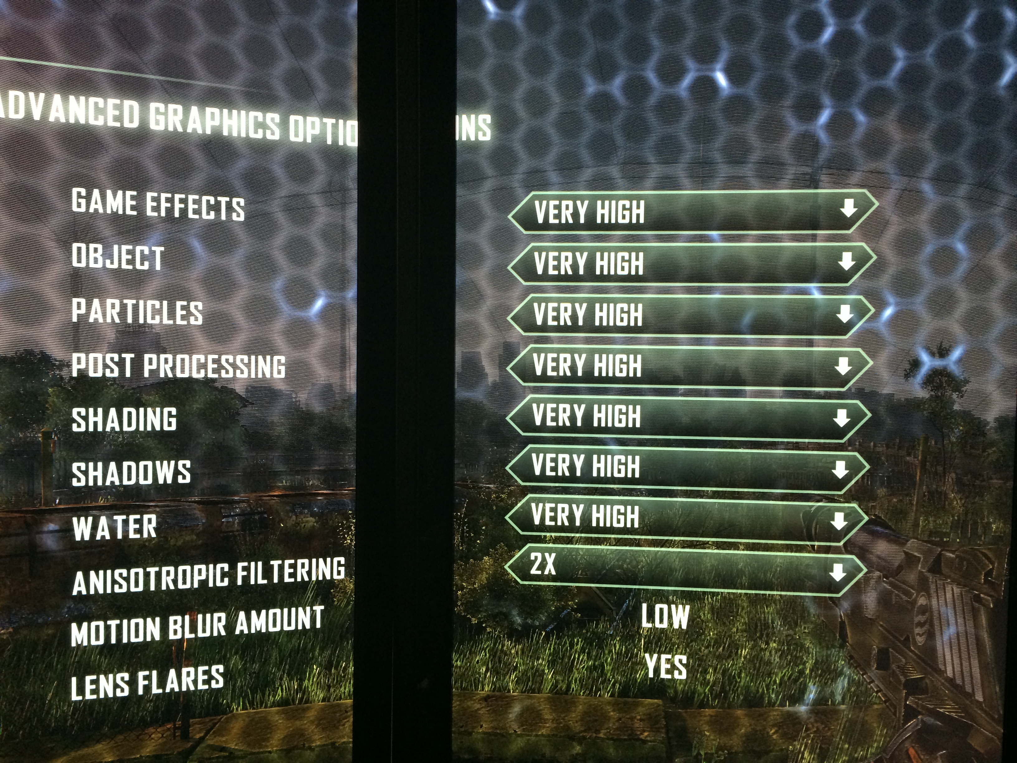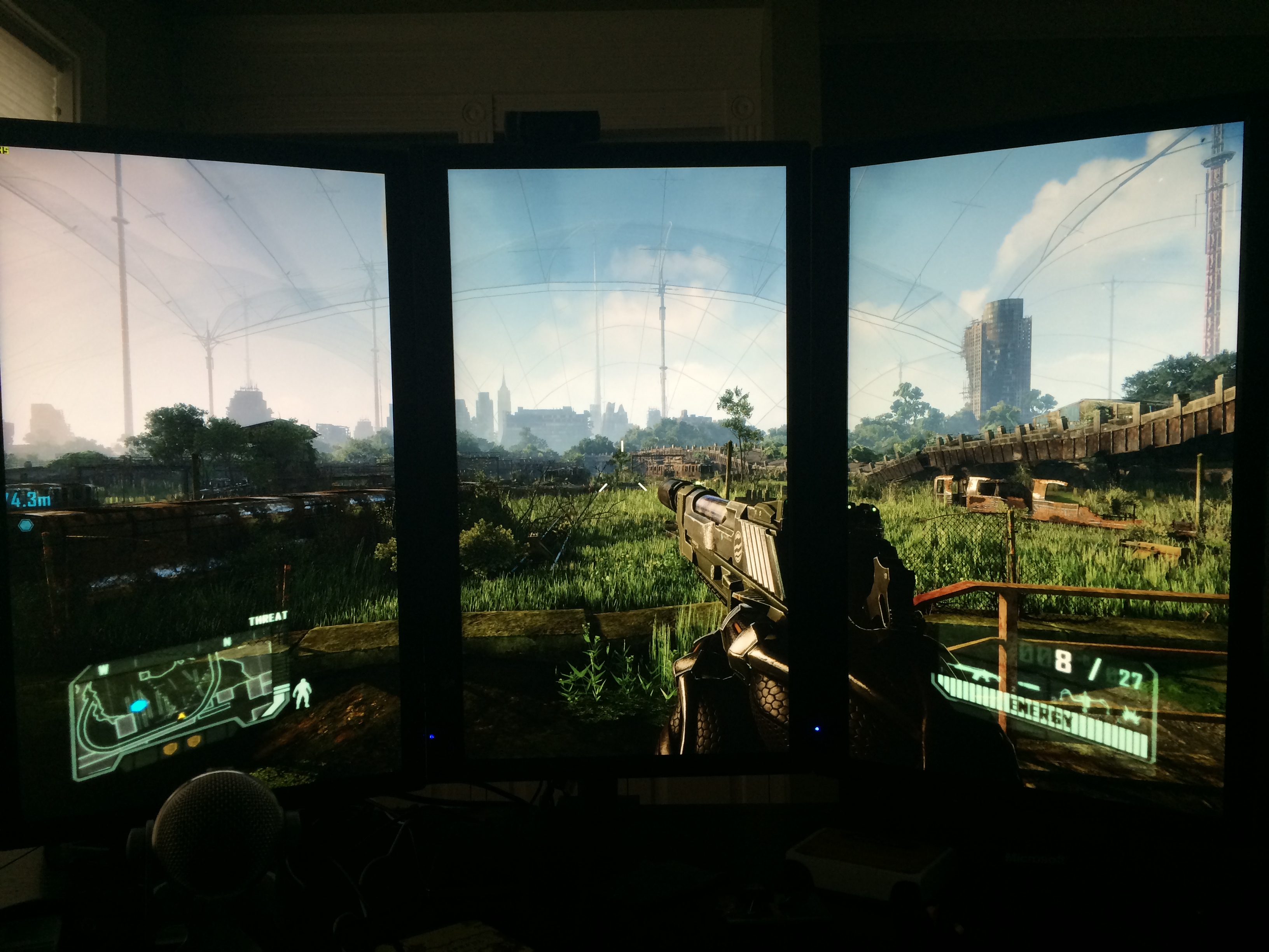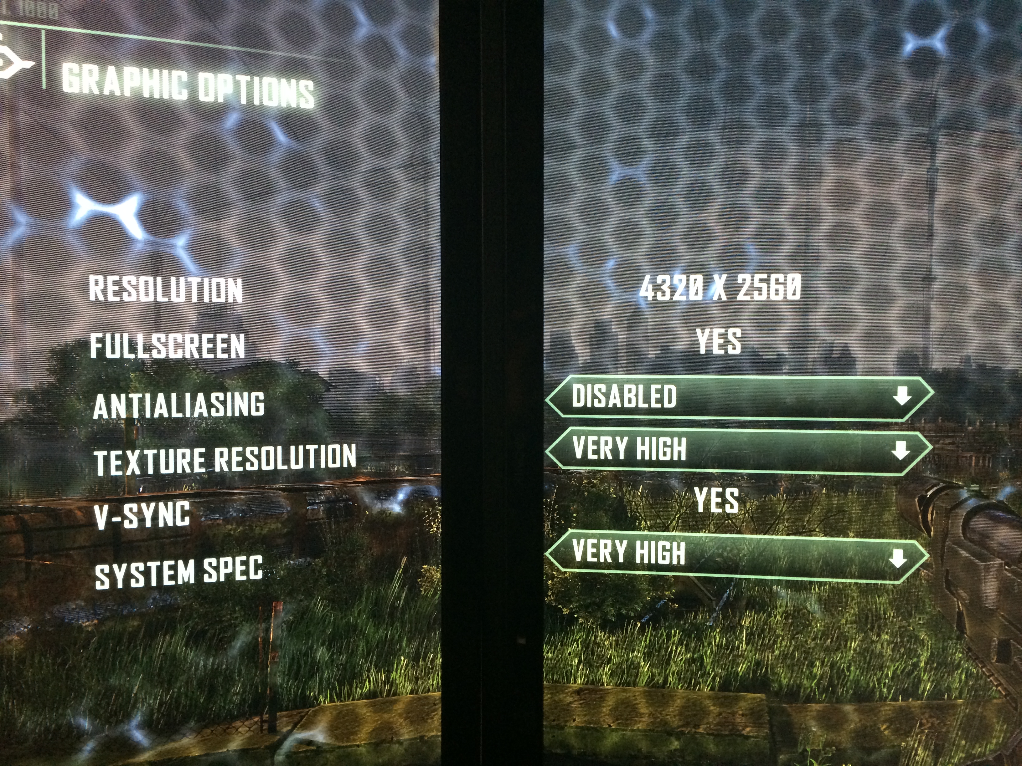 So far, not so great. It seems like tri-SLI Titan is really not up the challenge of 3 x 1440P surround! I did some run through tests of the first level of Crysis 3, and the results were even more brutal. With all settings set to “Very High”, and AA/AF on their minimal settings, framerates hovered around 30fps. Occasional highs could be found up to about 60, and the lows dipped into the mid 20s. Pretty depressing! So far it looks like “maxed settings” (even leaving aside AA which isn’t that important at this resolution in my opinion) aren’t going to be possible! 780Ti, despite having some great performance (surpassing Titan) at more normal resolutions, doesn’t help out much either. Surveying some SLI testing of 780Ti that has been done by a few of the pro sites, it seems tri-SLI Titan at this resolution would probably offer up maybe 5-7fps more. A nice boost, but not the type of real “game changer” performance that is needed.
