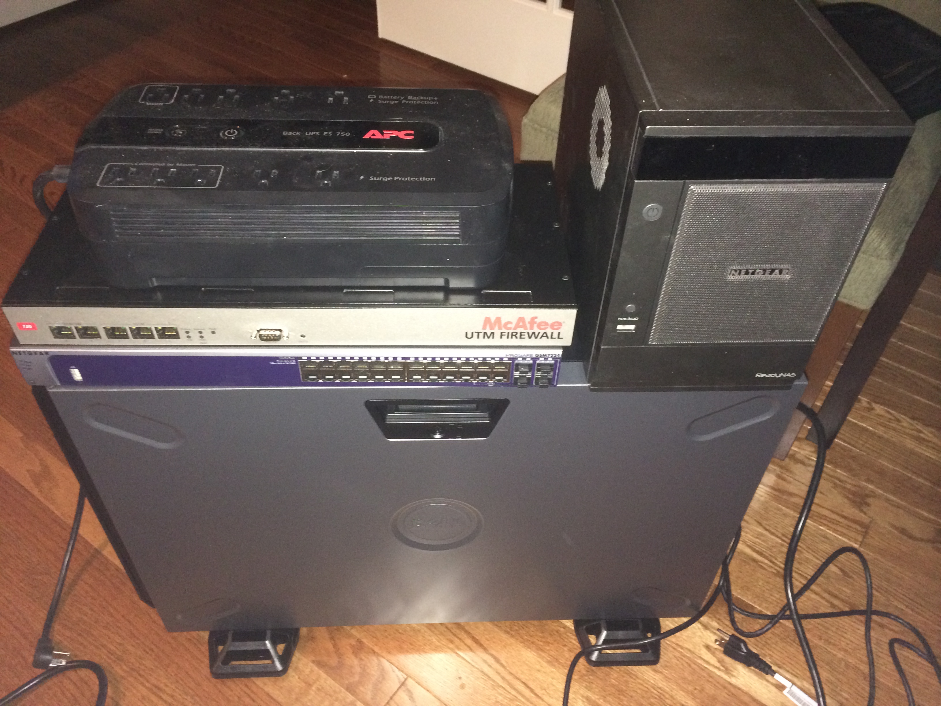 Really a great outcome! 9.2TB RAID 5 volume online in no time at all with no warnings and solid green lights. The addition of the T620 into the home office necessitated a full redesign of equipment placement due to space returns. I initially considered keeping my 4 slimline white box hosts, but after seeing how cool and quiet the T620 was at first boot, I made the decision to stick with a nested ESX/one-box configuration. This decision went a long way towards reducing the clutter and made for a pretty decent final layout. Here is a shot of the full set of lab kit tidily stacked together awaiting installation:
