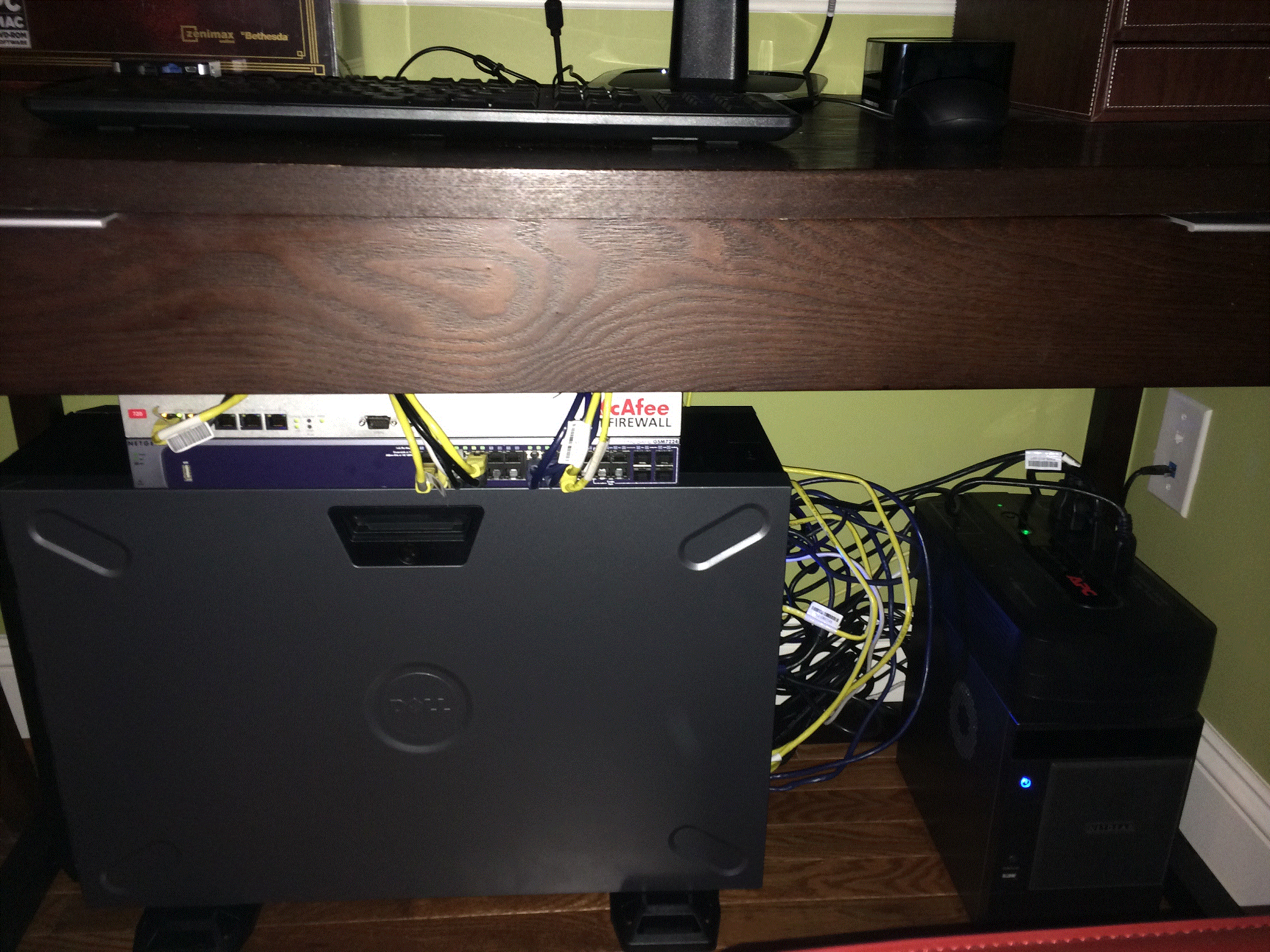 And here is a shot of the server nestled under the wife’s desk along with the fully cabled switch, firewall, NAS and UPS: