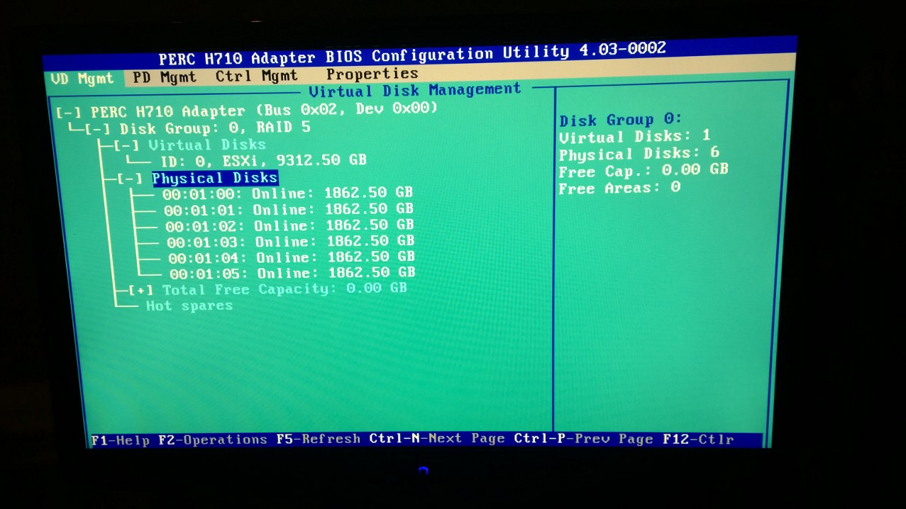 Initial boot actually seemed to go well with no complaints evident at all! Front lights were all green and nothing was showing in the PERC logs, nor were there any warning comments being thrown. Inspired, I went ahead and replaced the other 5 drives, then prepared to do a real configuration of the RAID card and see if the behavior stayed consistent. This was my first time configuring a PERC and I was pleasantly surprised by how intuitive the config went. I captured it on video rather then taking screen shots: