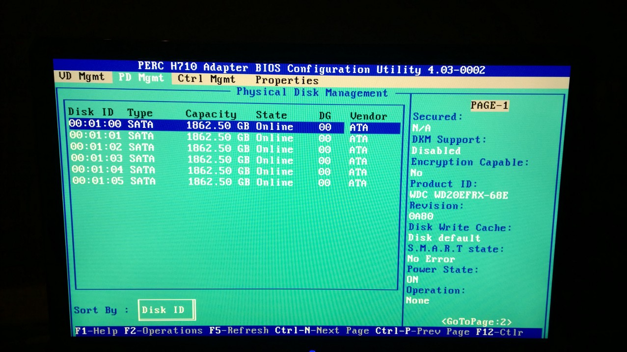 Speaking of which, let’s have a look at the PERC H710 setup. On first boot we determined that the T620 had no problem with the Western Digital Red 2TB OEM disks and, as you can see in the iDRAC physical disk ‘spoiler’ screen above, even recognizes them at 6Gb/s! With a full boat of 6 drives on-board it’s time to make a virtual disk. CTRL-R during POST invokes the RAID BIOS setup utility. I decided to do a quick video of the initial setup: