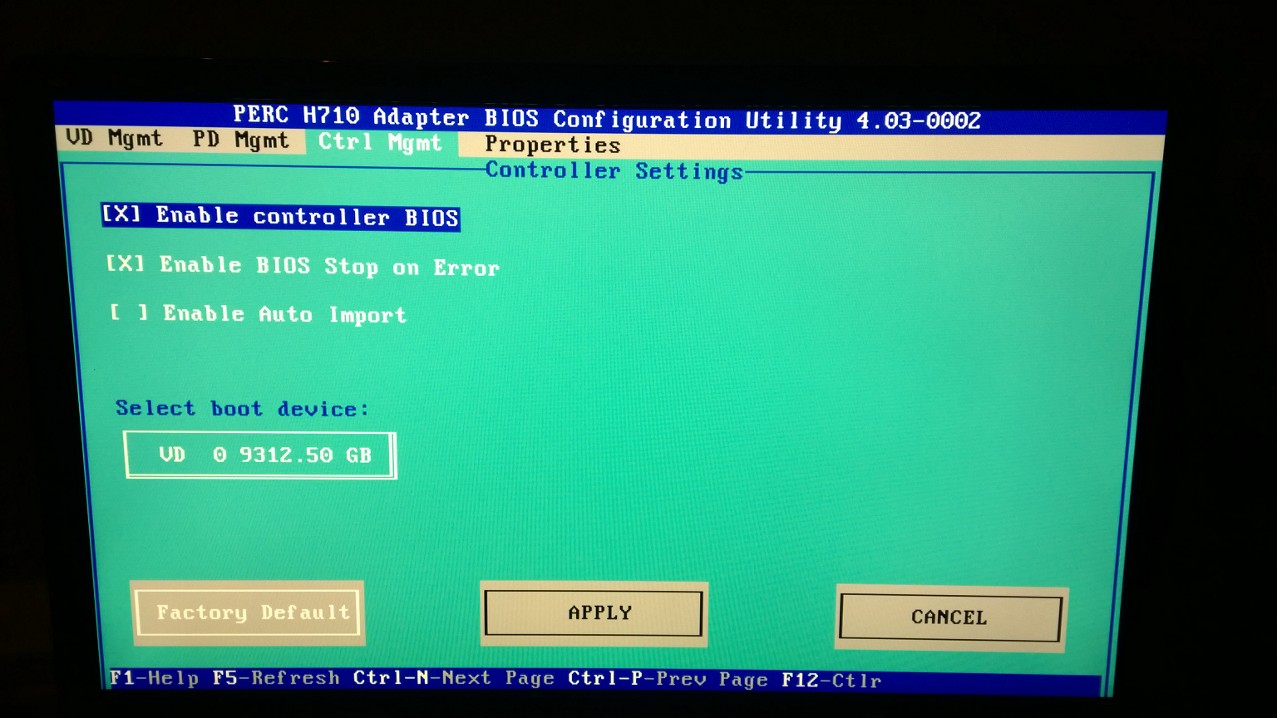 Controller Management tab allowing you to enable the BIOS and control its behavior as well as set the default boot device for the RAID controller: