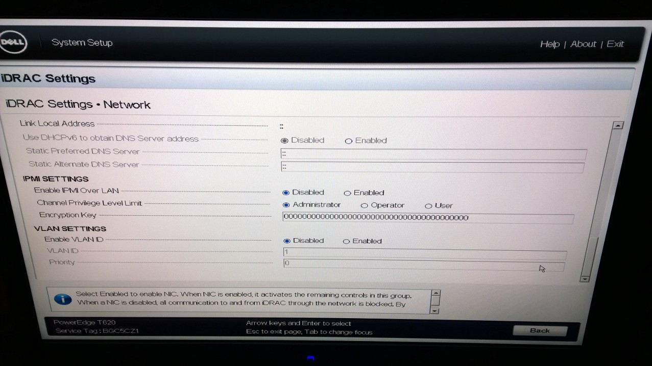 Last up we have two really cool options: IPMI over LAN and VLAN configuration. VLAN configuration of course allows us to configure 802.1Q tagging which is super important for any management device (which in production will almost certainly sit on a management VLAN). IPMI over LAN allows the iDRAC to participate in an Intelligent Platform Management Interface based console implementation: