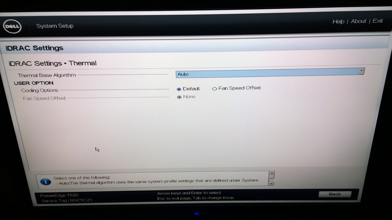 Leaving most settings at either their default or “power efficient” values I left the System BIOS Settings behind and moved on to the iDRAC configuration. Up top you get a summary of both the settings and firmware versions as well as the option to dive deeper on the Summary, Event Log, Network settings, Alert status, Front Panel Security settings, VirtualMedia settings, vFlash Mode, LifeCycle Controller, System Location, User Accounts, Power and Thermal settings: